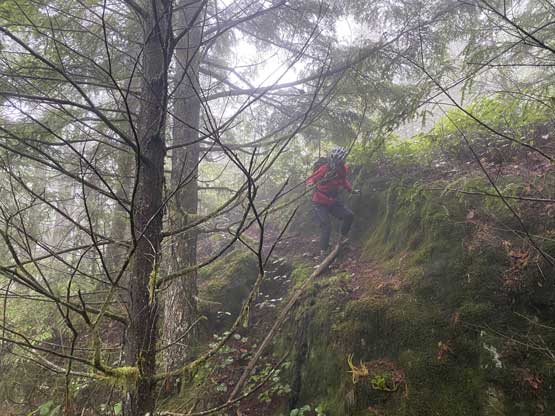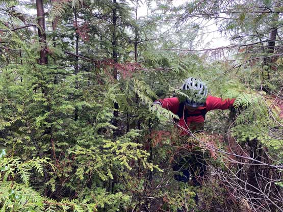 We ditched the bikes and bailed into the bush for the final 30 m gain to the true summit. The forest looked miserably and it sure was. The vegetation was soaked from the recent rain events and the bushwhacking was “BW4” until we broke out of the secondary growth mess. There were even thorny plants thrown in here and there. The true summit was located in some older growth forest so the final section was not too bad. Lily was more keen to look for mushroom while I was determined to find where the highest point was…
