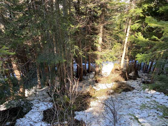 The ascent of Mt. Klaudt had taken longer than expected, that I should hurry up if I didn’t want to be late for work. For the most parts on the ridge I just retraced my own footprints on snow and lower down I took a bit of variation but still faced some bushwhacking. I took an old road down which dumped me about 1 km from the resort that I had to hike back up to grab my vehicle.