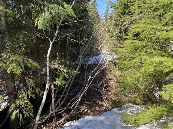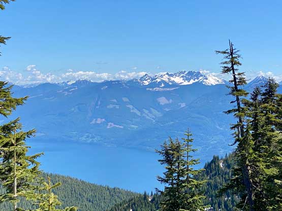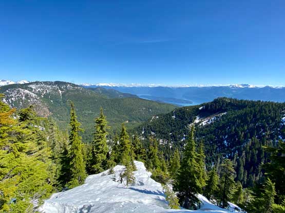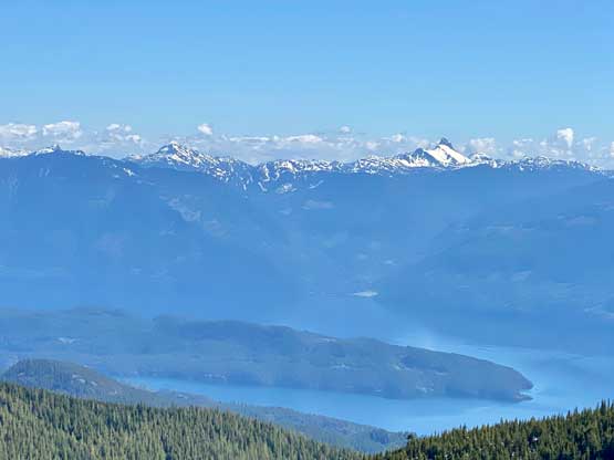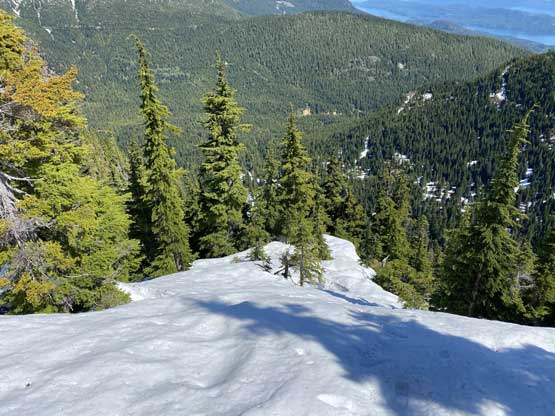 I used a series of connector roads to link up Cartmell Peak’s south ridge to the NW Ridge of Mt. Klaudt. The main branches were in decent shape for walking but once turning onto the spur road I immediately realized I was in for some alder fest. Thankfully there was still at least half a meter snowpack at the elevation of 1150 m so the bushwhacking was minimal. There were a few dry and overgrown sections that I simply bypassed by detouring around. I generally managed to stay on the spur road but left the road before the final switchback as I figured there was no further point with the bushy status and the increasingly thick snowpack. The aim towards the NW Ridge involved more bushwhacking with some route-finding that forced me to check GPS many times. I wasn’t expecting much in terms of views but there were two steep spots on the ridge that offered unobstructed views towards the northern half of Harrison Lake. The second steep step required a little bit of snow-climbing technique but I’m sure one can easily bypass it if one doesn’t dare to stay exactly on the ridge.