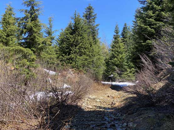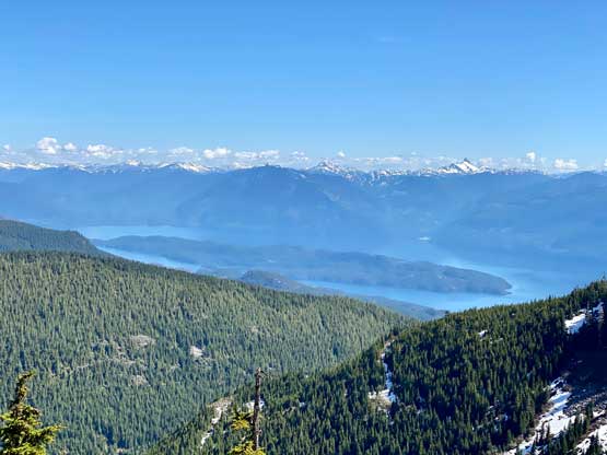 I used a series of connector roads to link up Cartmell Peak’s south ridge to the NW Ridge of Mt. Klaudt. The main branches were in decent shape for walking but once turning onto the spur road I immediately realized I was in for some alder fest. Thankfully there was still at least half a meter snowpack at the elevation of 1150 m so the bushwhacking was minimal. There were a few dry and overgrown sections that I simply bypassed by detouring around. I generally managed to stay on the spur road but left the road before the final switchback as I figured there was no further point with the bushy status and the increasingly thick snowpack. The aim towards the NW Ridge involved more bushwhacking with some route-finding that forced me to check GPS many times. I wasn’t expecting much in terms of views but there were two steep spots on the ridge that offered unobstructed views towards the northern half of Harrison Lake. The second steep step required a little bit of snow-climbing technique but I’m sure one can easily bypass it if one doesn’t dare to stay exactly on the ridge.