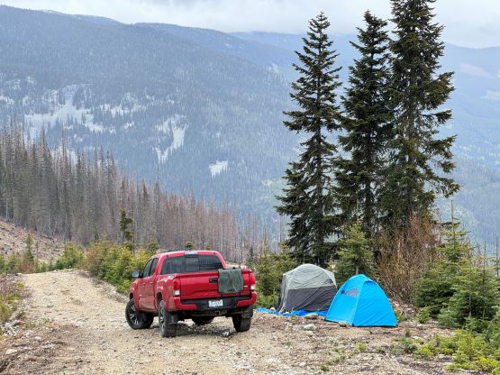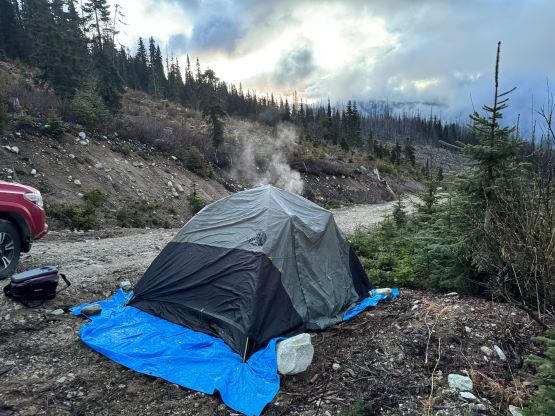 The four of us eventually left Vancouver at around 8 pm in the pissing rain and then learnt the heartbreaking outcome of our friends that went missing on Atwell Peak. It’s already my 4th time losing a friend in just the last few years so I was able to keep driving and a few hours later we made to Lytton. The rain had fortunately stopped. Matt J. had published the driving GPX track to further eliminate the work for us, but I still made an error right at the start as I confused the construction work site as the start of the FSR. There are basically two ways to get in, but the south side route was still not repaired. The north route was heavily blocked by the First Nation communities during the pandemic but had since reopened. There were many more turns coming up so Erica did the navigation for us (using my phone) and I was able to stay focused on the wheel. It unfortunately started to rain as we drove south towards that steep and rough spur road. The final few kilometers weren’t nearly as bad as I thought but one particular section did require a 4×4, high clearance vehicle with skills. I managed to drive us past Matt’s starting point and even found a decent spot to pitch two tents. The truck unfortunately had to be parked in the middle of the road but I also didn’t think anyone else would come here in the morning. It rained on and off during the next few hours but when the alarms went off at 4:30 am it had stopped. The morning routine was a bit miserable but at least we weren’t starting in the rain.