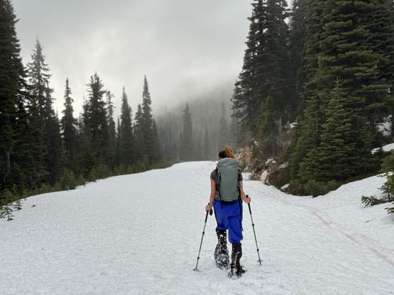 There was technically only one large patch of snow that stopped us from driving further, as otherwise we could have driven very close to the pass. We then mostly just followed the previous parties’ GPX track but I made a slight variation to throw in more side-hilling but less elevation loss/regain. The plod onto the first bump was a bit tedious as the snowpack wasn’t quite continuous and it was not possible to completely follow their footprints, so I did have to consult with the phone many times to make sure our bearing was correct. The ceiling was low so we quickly plunged down the north side to the outflow of a rather major lake, before proceeding onto the second bump. The snow quality was totally garbage, that even with snowshoes and the previous tracks we often sank to the ground. There’s one long stretch of dry ground to ascend the south slopes of the second bump, but we were too lazy to take the snowshoes off. I then led us traversing leftwards to a long continuous snow gulch to bypass the top of the second bump. This one does not boast over 100 m prominence so there’s no need for us to ascend to the top of it.