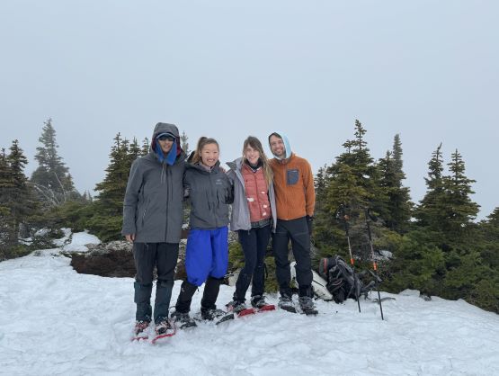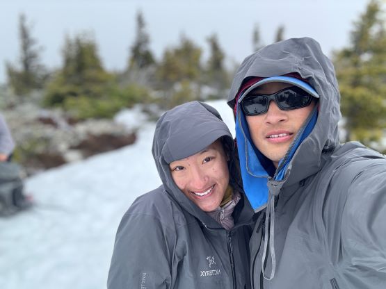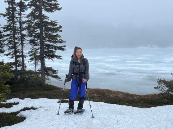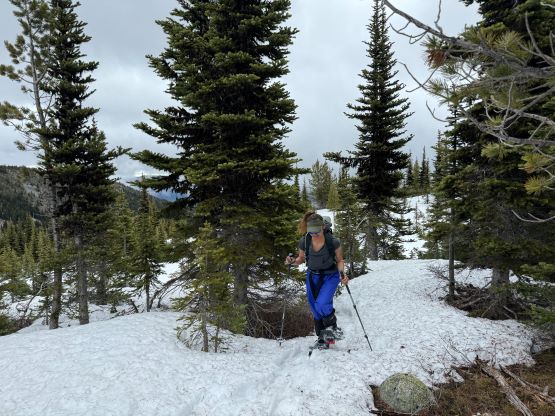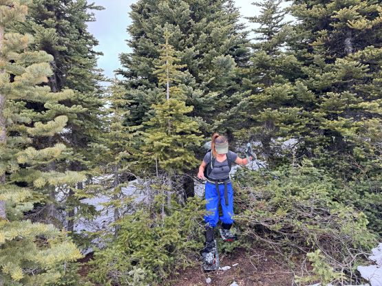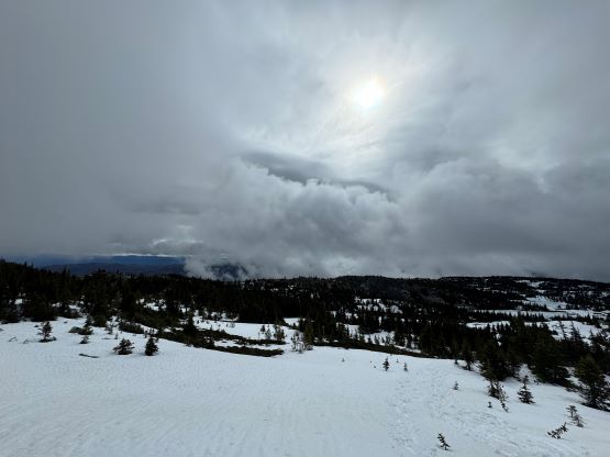 By this point the ascent had become a total plod and because of the missing friends none of us was quite in the mood to really “have fun” here, but we were in for the mission so we must get the job finished. Descending the north side of the second bump I somehow oriented too far skier’s left and had to make some side-hilling to rejoin the previous parties’ tracks, then to ascend the true summit we had to deal with more undulating terrain with lots of melted-out stretches. Those stretches weren’t particularly long so we made the snowshoes to take the beat and just plodded them over those boulders and grass. There were more outflows and wetlands to plod through. The weather was not motivating when we arrived at the summit but two sucker holes made us wait there for a few more minutes, then just after we started the descent the weather cleared and revealed some views. Elise and Francois was ahead but Erica and I stayed behind for another 10 minutes and got more views.