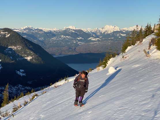 Moments into this second period of straight-up ascent we encountered softer snow and donned snowshoes. My new TSL Symbioz snowshoes were very disappointing. They weren’t too terrible on the straight-up portions but their traction wasn’t aggressive enough to tackle hard-packed slopes at 35-40 degrees, which was easy peasy in the MSR Lightning Ascents. There were some prolonged stretch of traversing and side-hilling on the upper route and that’s when the real shit show began. After coming out to a massive clear-cut we ascended diagonally towards climber’s right to short-cut onto the highest spur road. The surface of this spur road wasn’t flat neither so we were constantly traversing/ascending 30-35 degree slopes for at least 1.5 km distance. At one point I had to take the snowshoes off to boot-pack and I barely managed to traverse across that stretch without having to don crampons.