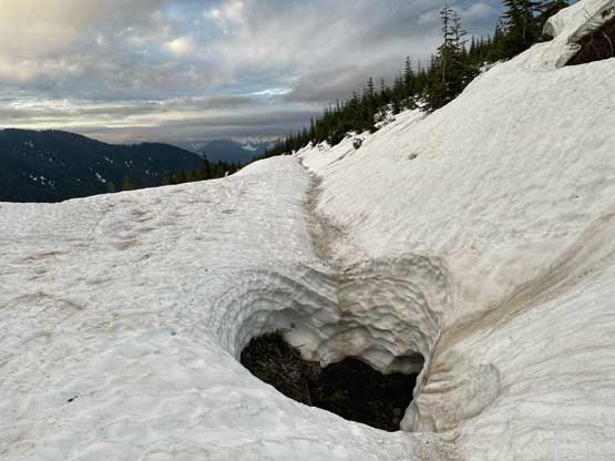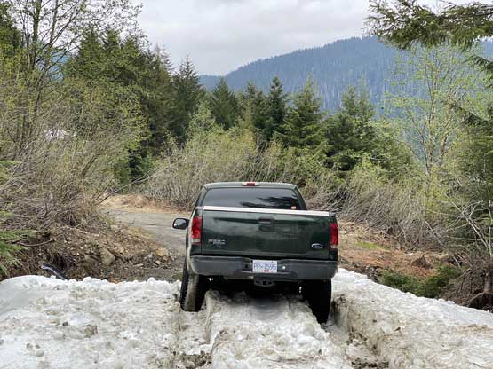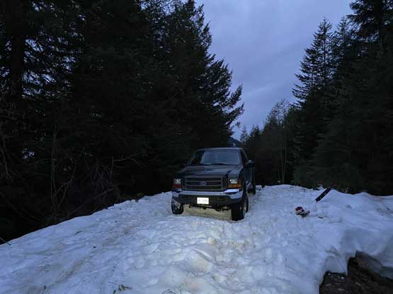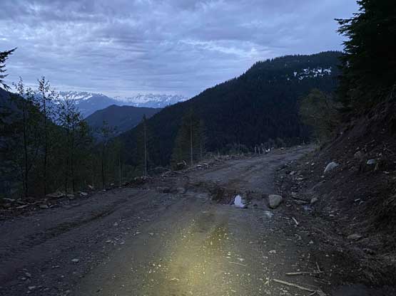 At around 3:20 am I woke up hearing something and sure enough, two guys came over and knocked my door. I thought they were police or some kind of construction workers but then I realized there’s no way I was in anyone’s private property as I did not encounter any sign of “no trespassing”. I hesitated to open the door but had they been thefts trying to rob my vehicle they would have just smashed the window or flee upon seeing someone still inside the vehicle, so there might be some problems. I opened the door and sure enough, they had driven past this spot an hour ago and got their truck stuck in a deep patch of snow. Part of me wanted to help but there were two problems. Firstly there’s a reason why I parked at this spot because I did not want to drive across that ditch ahead. They did say that’s the worst spot but that didn’t mean this ditch would get any easier. And two, despite that I had driven thousands of kilometers on logging roads I had zero experience of rescuing nor any knowledge about mechanics and in fact, I had never even touched a tow strap yet. I deeply believe if one day I finally had to call for a rescue on inReach it’ll be a truck problem on a remote FSR, so I said no to them and went back to sleep. I did ask if their truck’s in any danger of slipping further and they said no, so the best bet for them was to continue walking down and (hopefully) find someone else more experienced to help. Of course the sleep did not come easily so after 20 minutes I got up and started cooking some breakfast. I spent 10 minutes preparing a hot meal of ramen before starting my plod, still in pitch dark.