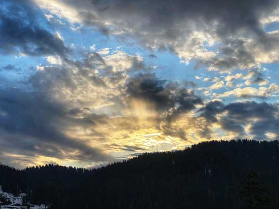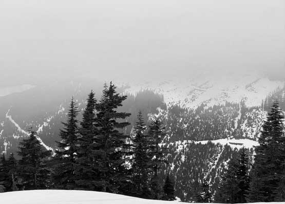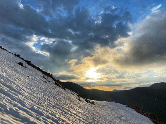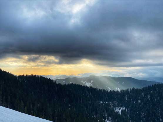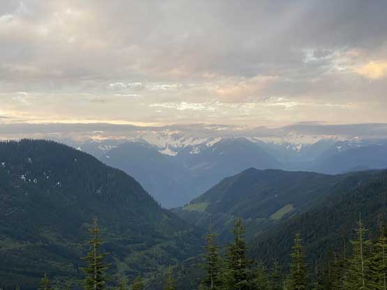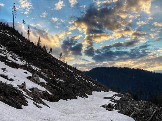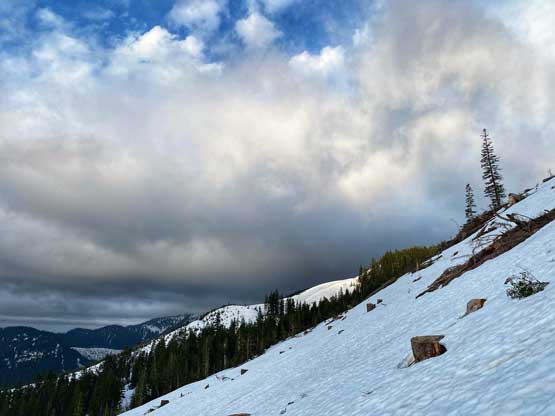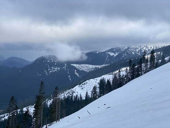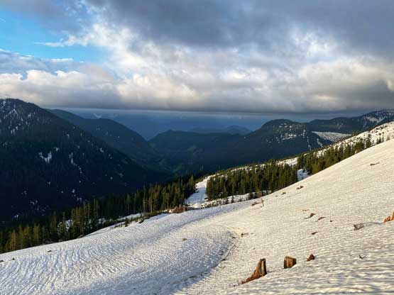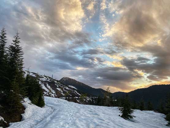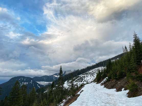 As expected, the road was in a great shape after that initial ditch and sure enough, after 1.5 km / 25 minutes of walking I came to their truck. There’s one more person in the truck but it seemed like he was sleeping so I didn’t bother to wake him up. The patchy snow soon became continuous in another few hundred meters and surprisingly I found a fresh set of tracks to follow. Initially I thought those must be tracks from the other guys but there were also pole tracks and the foot prints were clearly left by sturdy hiking boots if not mountaineering boots. After a couple switchbacks the tracks were still heading towards the direction I wanted and at this point I was confident that someone must have seen the recent Facebook post and went after Mt. Parker on Saturday. There was an annoyingly long and flat section around 1200 m but the view from this stretch was not bad. The weather was unfortunately, not nearly as clear as I had hoped for, though watching the morning light combined with a band of low clouds rapidly closing in from west was kind of cool.