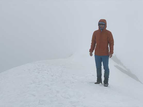 The route then ascended a steep-ish cut-block for at least 100 vertical meters into the mature forest onto SW Ridge then stuck close to the ridge crest. At one point the tracks split. I followed their up-tracks because it’s easier to use the up-track’s foot prints but the up-track got a bit steep and exposed. I could see why they picked a variation on the descent. The clouds had unfortunately fully obscured the summit so the last half an hour was spent only to put a check mark on this summit. I waited on the summit for another 15 minutes. I even got some cell signals so checked the weather forecast, and not to my surprise, it had degraded since the day before. I figured there’s zero chance of getting any view so I quickly started the descent.