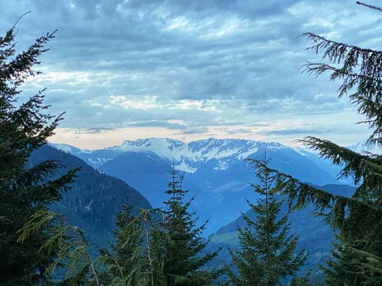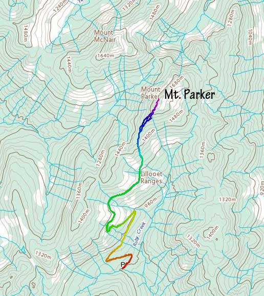 The weather for this past Sunday had been a mixed bag with precipitation forecasted to start in the PM. There seemed to have a brief window in the morning and the farther east the better the forecast was. I had a few hours to collect my thoughts after coming back home from Klesilkwa Mountain in Chilliwack Lake area and in the end I decided to push for Mt. Parker solo. I had to be back home by 4 pm for work and I was already tired from the lack of sleep recently, but the weather in the foreseeable future looked rather dreary and I did not want to miss this morning window. I drove out of White Rock at 9:30 pm and made to Ruby Creek in an hour and half. The going up the Ruby Creek FSR was smooth for a few kilometers until the grades picked up. From around kilometer-6 onward I encountered at least 100 water bars. None of them provided a challenge for my trusty Taco but it was very annoying. The ditches gradually became deeper and bigger as I drove past around km-11 and eventually I decided to park in front of a deep ditch right after a bridge at 780 m elevation. The ditch was not wide nor “big” for that matter, but deep and steep. This spot was only 1 km from where the previous guy parked and I estimated at the worst case scenario, an extra 1.5 km of walking each way. It was almost midnight so I quickly went to sleep.