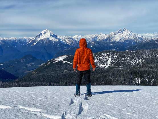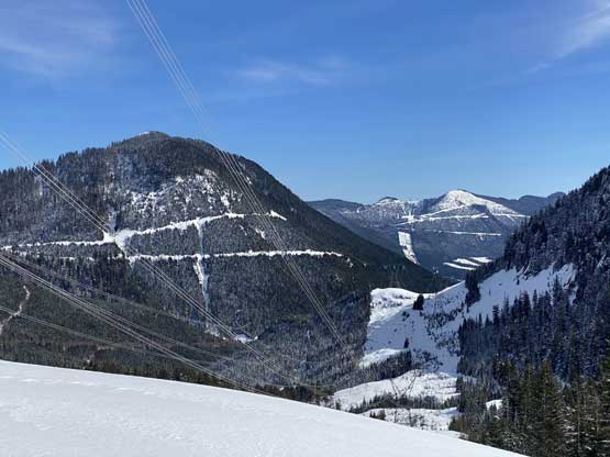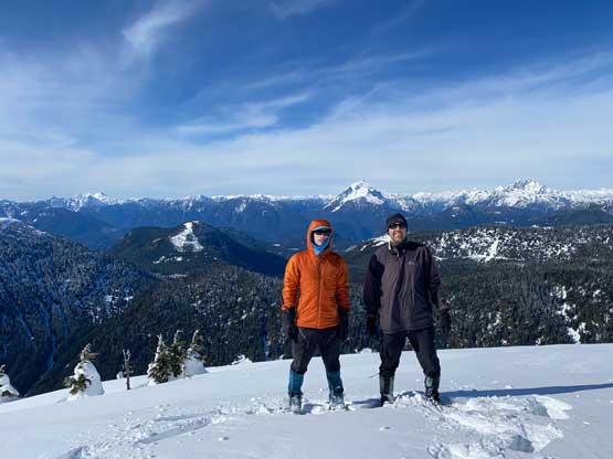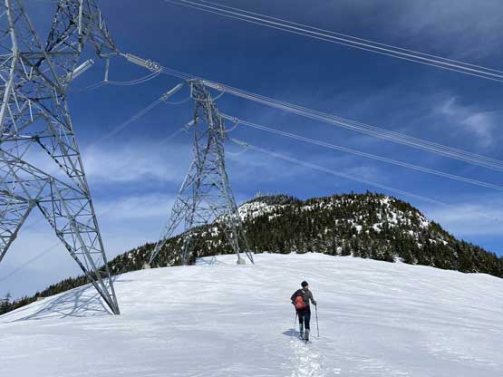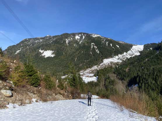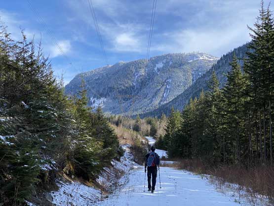 About a year ago Ben Shewan from Mission had reported an ascent of “Nursia/Norrish” on Instagram I took a mental note on that. The access and approach via some powerline road system looked friendly from satellite images and the south ridge looked to a fun ramble on snowshoes when a thick snowpack covers the bushes. Vlad and I pulled a last-minute trigger for this past Monday. A stretch of stable weather had finally kicked in but the previous storm had dumped a shit ton load of precipitation over the weekend. The conditions in the mountains would be unknown with a great variety of possibilities so we picked this rather easy objective just to be sure we could definitely bag the summit. I opted to carry and use my 30′ snowshoes also to give more contingency in case the trail-breaking effort turned into a nightmare. In retrospect this turned out to be an overkill as the conditions were much firmer than I thought.
