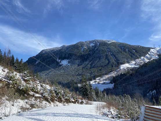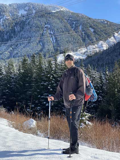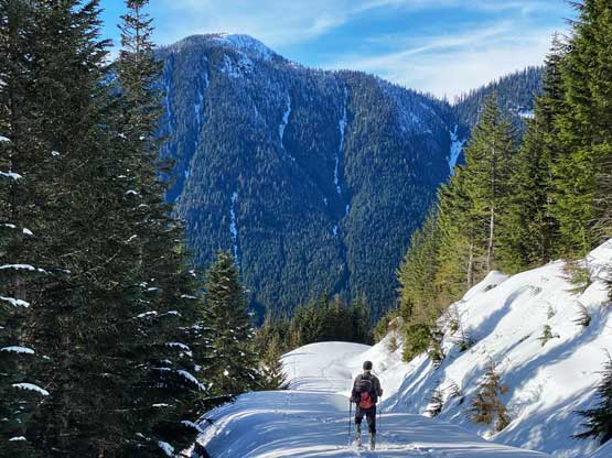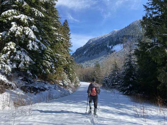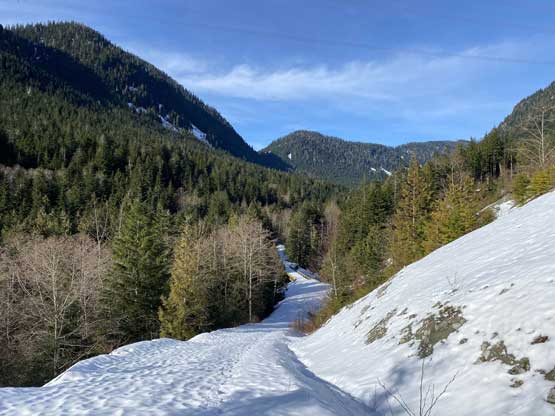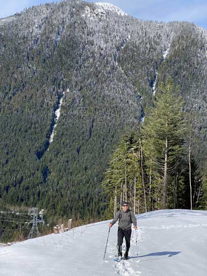 Vlad showed up in White Rock’s bus station at around sunrise time and we were at the trail-head within an hour and half. The actual trail-head has a gate that would be closed after sunset. We parked inside the gate nonetheless as we were confident to get out before dark. The powerline road beyond the parking lot was unfortunately gated. The first half of the hike was a boring plod up this road for quite a few kilometers with about 400 m elevation gain. We hit continuous snow at the highest spot of this flattish stretch of the roads at around 550 m elevation and subsequently strapped snowshoes on. The roads then did about 50 m of descent to cross Cascade Creek (on a nice bridge). Nobody had gone beyond this spot so we had to break trail for the rest of this day. The upper roads leading to the pass at 950 m elevation south of “Nursia Peak” had a few annoying creek crossings. The trail-breaking was averagely moderate but heavy at times due to wet fresh snow balling under our snowshoes.