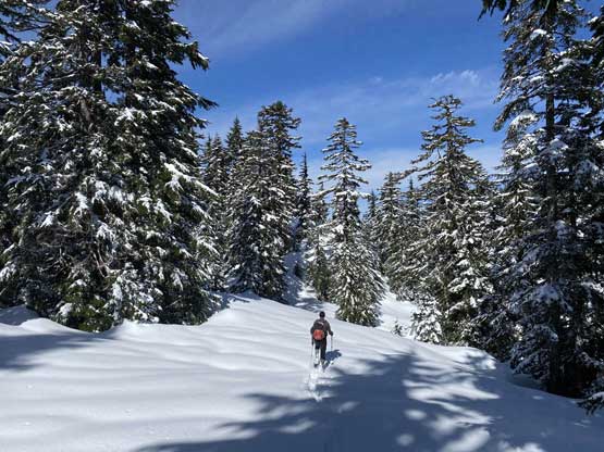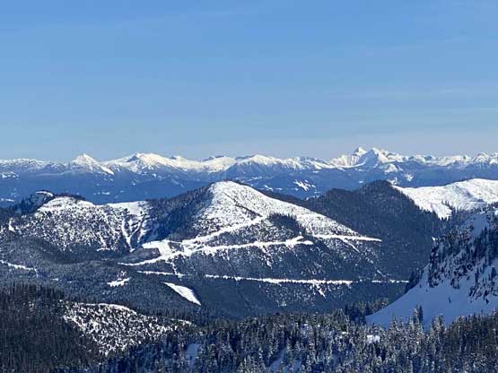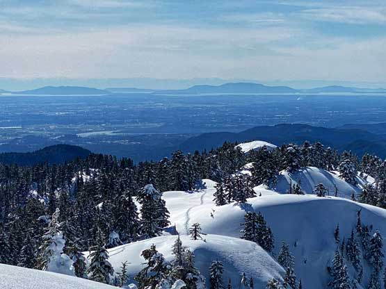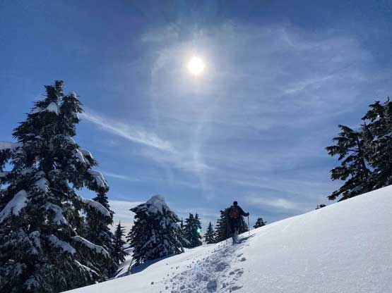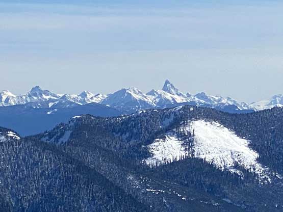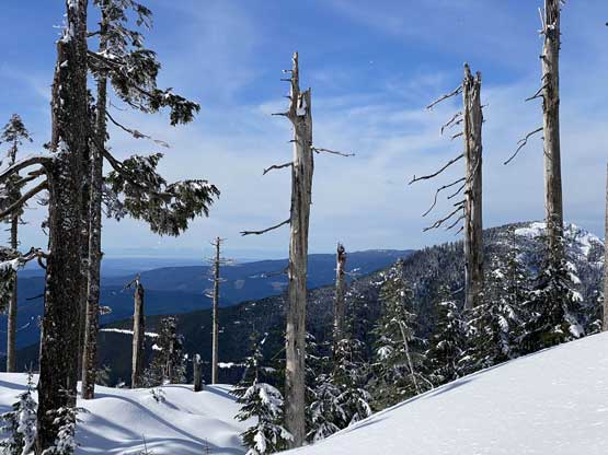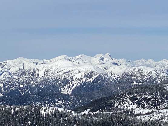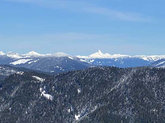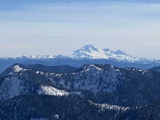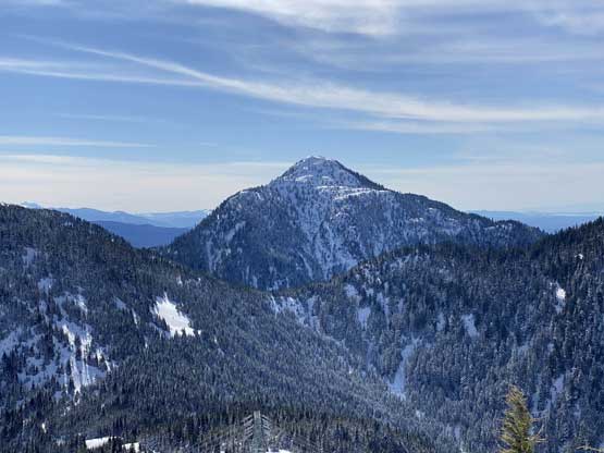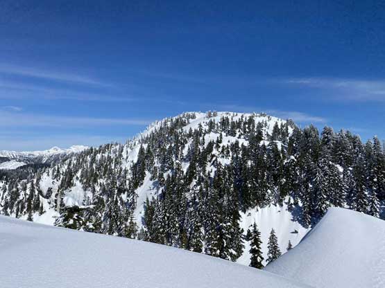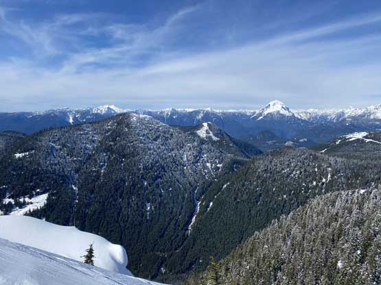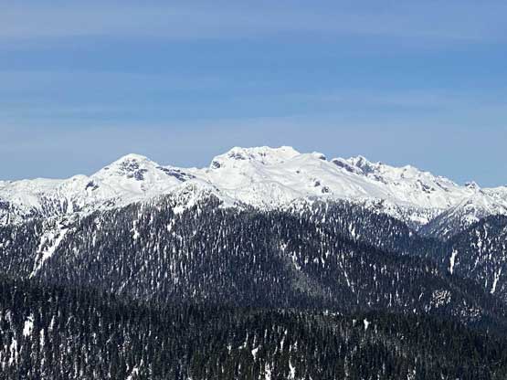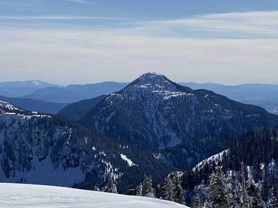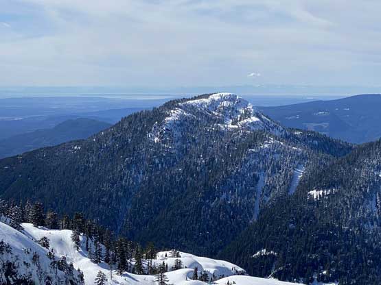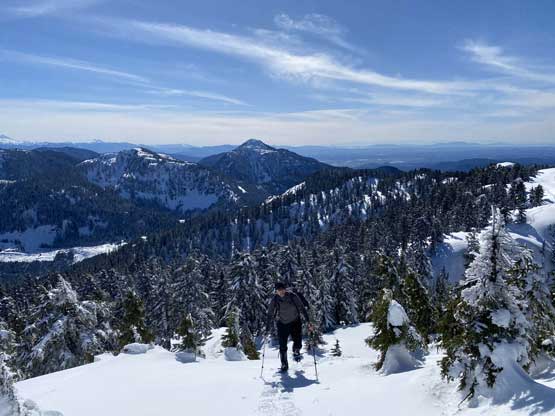 Some cold wind picked up once we reached the highest end of this road. The next stage involved some steeper ascents through tight secondary growth forest. This section would be impossibly ugly in summer time but with a March’s snowpack the going was reasonably okay. We did have to whack through some tree branches but I wouldn’t call this “bushwhacking”. Once the ridge petered out we had to deal with some continuous up-and-downs for a few more kilometers’ horizontal distance, although the views were getting better and better. One particular drop worth noting was right after the first expansive vista point, that we were forced to take snowshoes off and down-climb facing into the slope. It was bout 40 degrees with moderate exposure to skier’s left and the hard crust under the fresh power was very icy. The true summit was on the far end of the ridge and still involved a few more sections of up-and-downs.