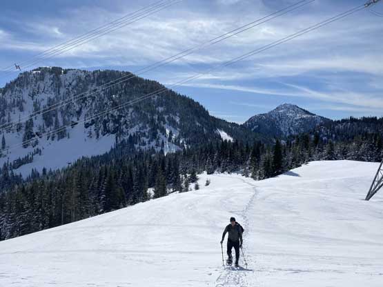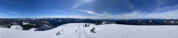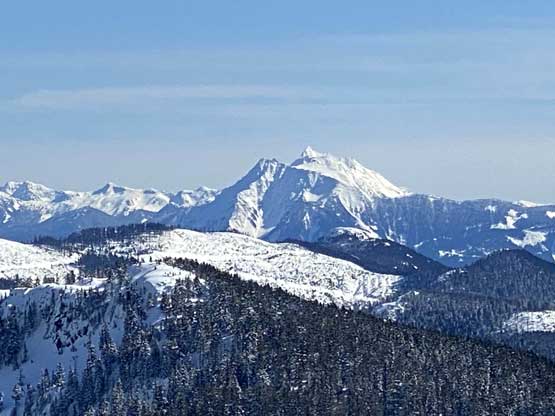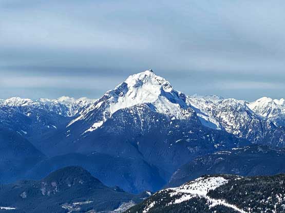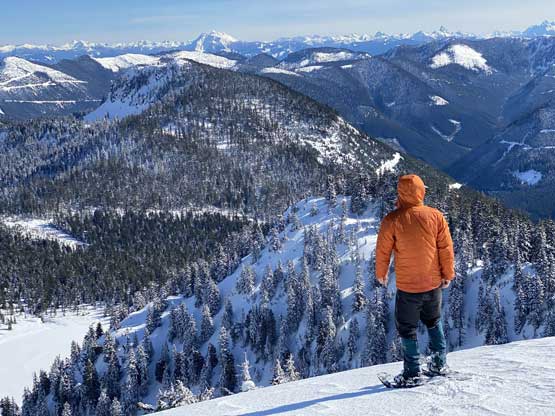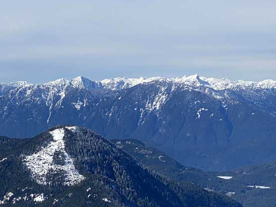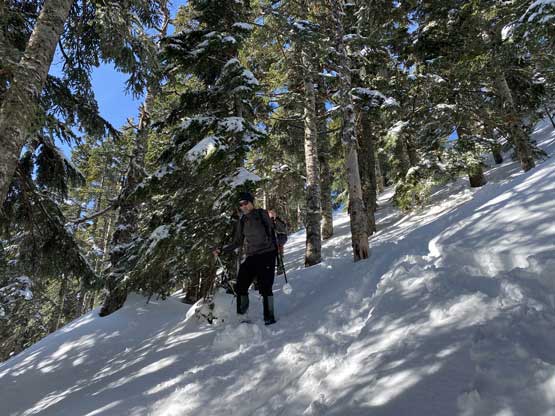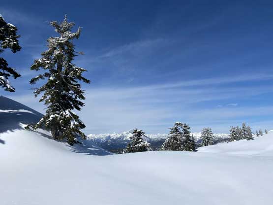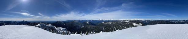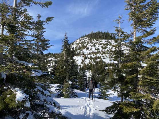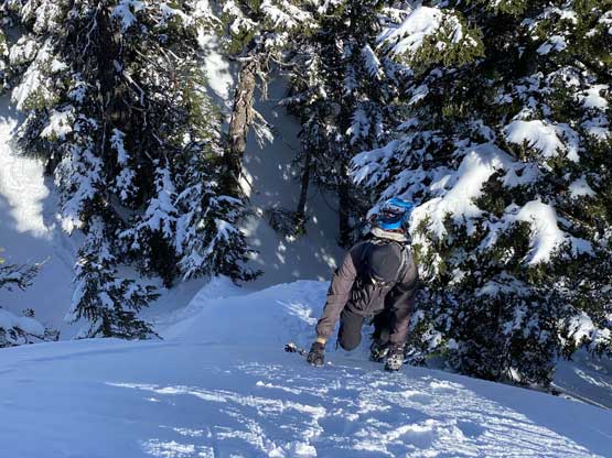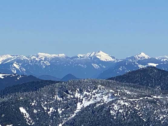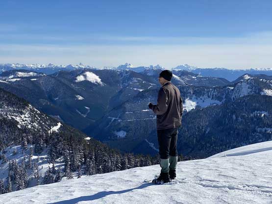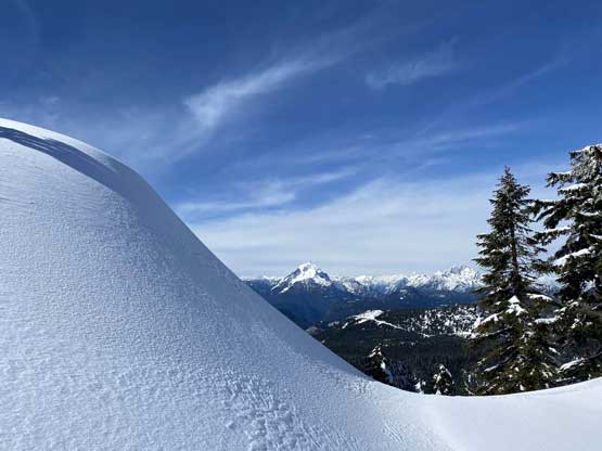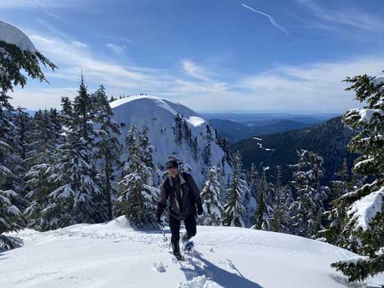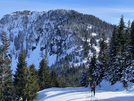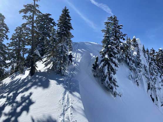 Some cold wind picked up once we reached the highest end of this road. The next stage involved some steeper ascents through tight secondary growth forest. This section would be impossibly ugly in summer time but with a March’s snowpack the going was reasonably okay. We did have to whack through some tree branches but I wouldn’t call this “bushwhacking”. Once the ridge petered out we had to deal with some continuous up-and-downs for a few more kilometers’ horizontal distance, although the views were getting better and better. One particular drop worth noting was right after the first expansive vista point, that we were forced to take snowshoes off and down-climb facing into the slope. It was bout 40 degrees with moderate exposure to skier’s left and the hard crust under the fresh power was very icy. The true summit was on the far end of the ridge and still involved a few more sections of up-and-downs.