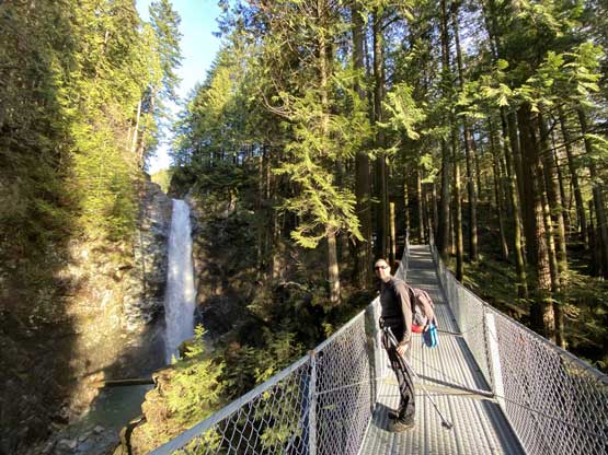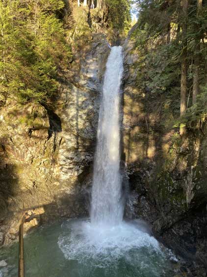The true summit had a nice 360-degree panoramic view as well as cell services so we lingered quite long. Eventually the cold wind forced us to retreat. I took a glissade down from the true summit but got snowed in my pants, and decided to just walk down for the rest of this trip. The snow condition was a bit shitty for descending on snowshoes. We both constantly slipped on the icy surface and the fresh snow on top of that layer had turned slushy at this point. A few steep rolls required some caution. Vlad talked about to ascend the unnamed peak “Rose NW3” but I didn’t quite echo that as I didn’t want to claim that unofficial name. Thankfully Vlad wasn’t quite interested in that added task once we got back onto the road section, so we leisurely walked down. Near the end of this trip we paid a quick visit to Cascade Falls. I totally see this place gaining popularity once Instagramers discover it.