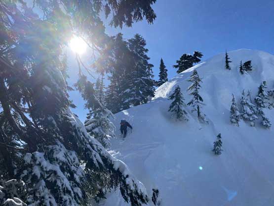 Some cold wind picked up once we reached the highest end of this road. The next stage involved some steeper ascents through tight secondary growth forest. This section would be impossibly ugly in summer time but with a March’s snowpack the going was reasonably okay. We did have to whack through some tree branches but I wouldn’t call this “bushwhacking”. Once the ridge petered out we had to deal with some continuous up-and-downs for a few more kilometers’ horizontal distance, although the views were getting better and better. One particular drop worth noting was right after the first expansive vista point, that we were forced to take snowshoes off and down-climb facing into the slope. It was bout 40 degrees with moderate exposure to skier’s left and the hard crust under the fresh power was very icy. The true summit was on the far end of the ridge and still involved a few more sections of up-and-downs.