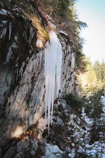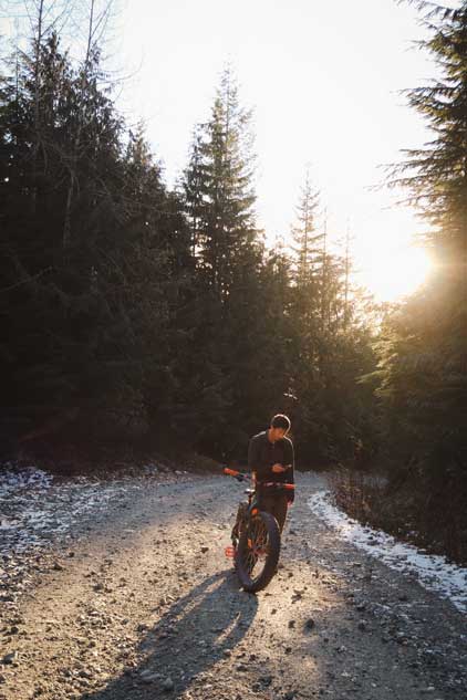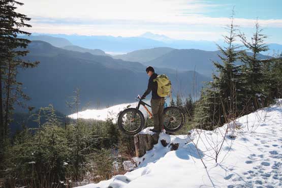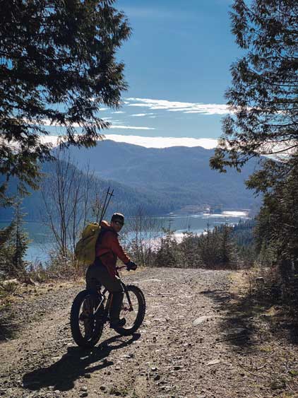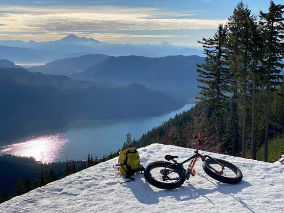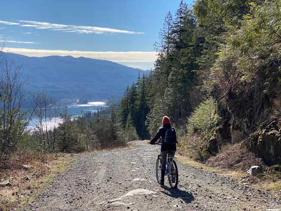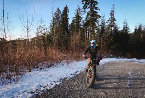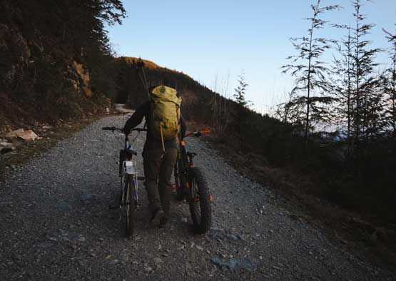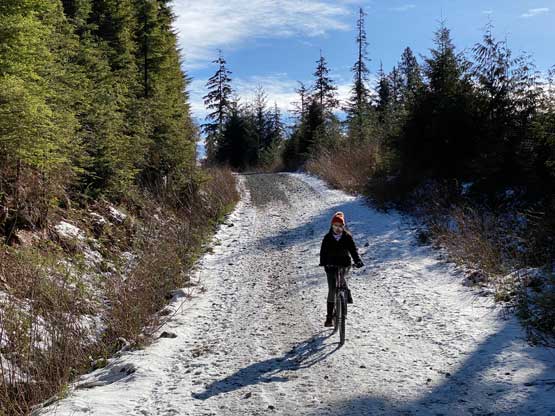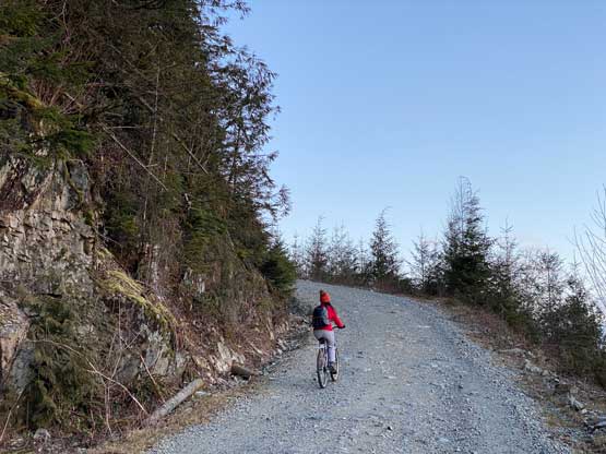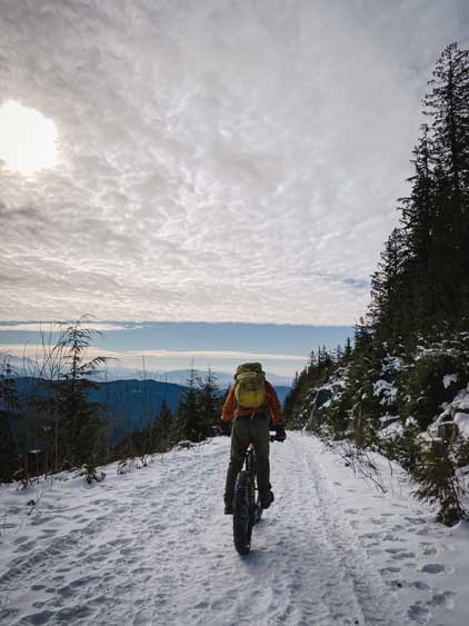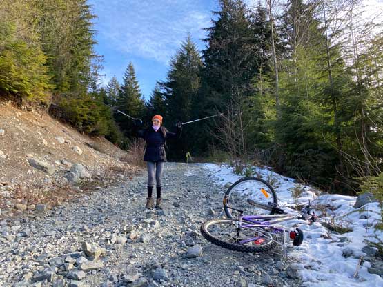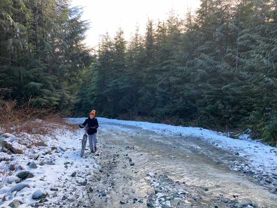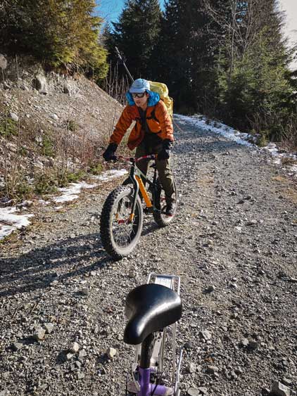 The road was quite steep especially on the lower slopes up to around 500 m elevation so we mostly just pushed the bike up. I could actually ride probably half of these lower stretches on my fatbike, but Wendy’s city bike wasn’t suitable for the job. Even pushing that crappy city bike up the steep hill was a tiring work out. To make sure we definitely could get back home by lunch time I offered to help pushing her bike to speed things up. I developed a strategy to push both bikes (one on each hand). The effort to push Wendy’s bike was probably two times more than mine, so a while later I gave the bike back to Wendy. We just took our time, slowly and steadily with lots of breaks and eventually made to that junction at 500 m. From there we had about 2 km of flat-ish FSR that we both could easily ride on. We started to encounter snow and ice on the road but such did not impose any problem to the riding.