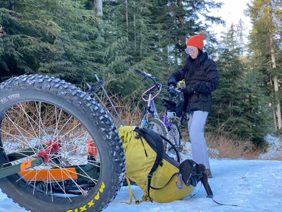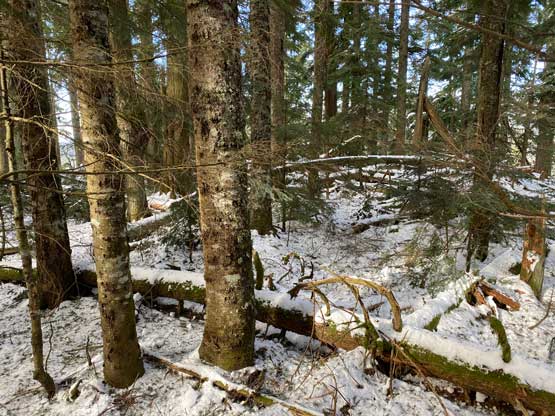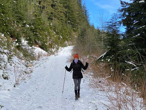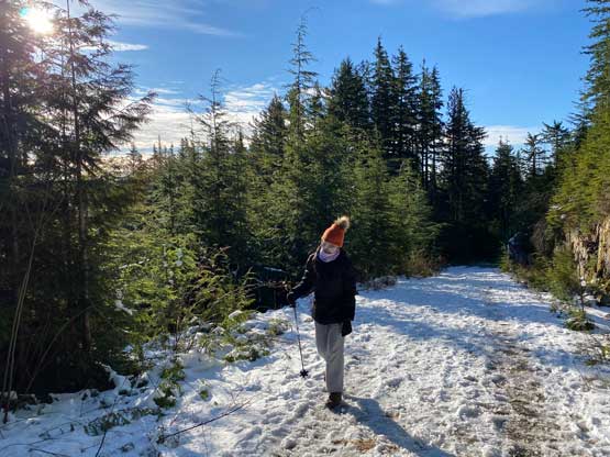 There was a secondary gate when we were supposed to take the left (rougher) branch towards the summit and Wendy ditched her bike here. This spur road was proper mountain biking terrain. I decided to push/ride the fat bike to at least the lookout at 700 m since my bike was designed for riding these rough and steep stuffs. The snow had become deep but the abundant foot traffic in the past several days had packed down the entire road such that post-holing was never a problem. We took another few breaks but eventually made to the viewpoint. Wendy opted to rest and play with more photography while I carried on to tag the true summit. I did a short loop bushwhacking in the forest tagging three separate “high points” to make sure that I absolutely had tagged the summit. The short-cut descent back to the road was very steep, slippery and bushy. I then easily descended back to that viewpoint. Wendy was already hiking towards me because sitting at that viewpoint was quite cold in this Arctic Outflow event. The wind was actually not bad, but the temperature was well below freezing.