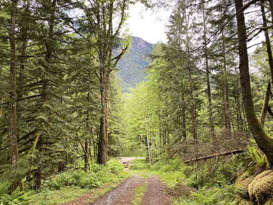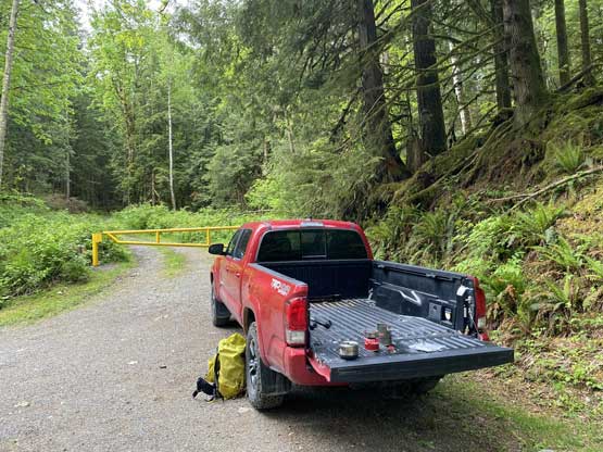 This peak also boasts a somewhat distinct boob-shaped profile when driving westwards down Highway 1 from Hope towards Chilliwack and in fact, I probably would have called it “Green Boob” had it not been named yet. Earlier in this year “Sasquatch Peak” along with Mt. Hicks had suddenly caught the “SWBC Peak Baggers” attention due to its prominence that at least half a dozen groups had gone in and bagged it within a period of a month. I waited a little longer to let those Facebook stories settle a bit in my memory. Ideally these peaks should be done in winter when avalanche danger is too high to attempt bigger objectives but there’s a problem. The gate at the entrance of Sasquatch Provincial Park is closed in winter meaning an extra 5 km of biking/walking is required. I was not too keen on that. The solution was then to bag it in spring as a before-work exercise and I pulled the spontaneous last-minute trigger on this Thursday as I couldn’t come up with a better objective. As always I preferred to car-camp so that I could get a few extra hours of sleep. I drove out of White Rock on Wednesday night after work at 10:30 pm and made to the “trail-head” past midnight and simply slept on the passenger seat of my truck.