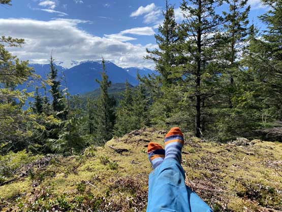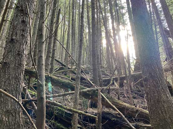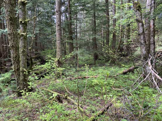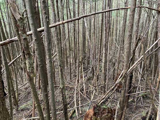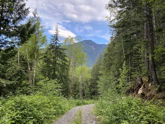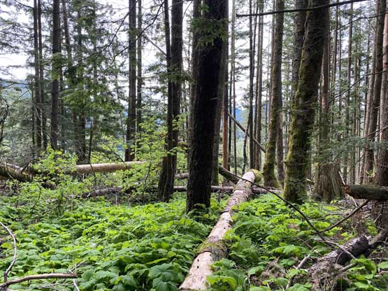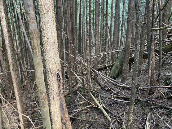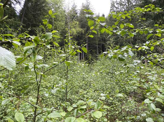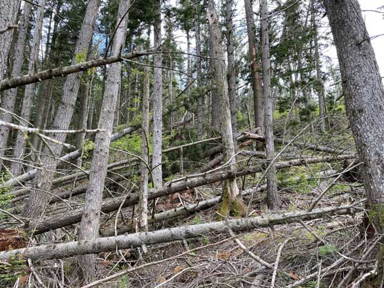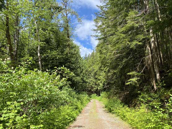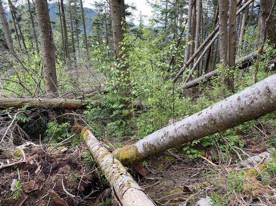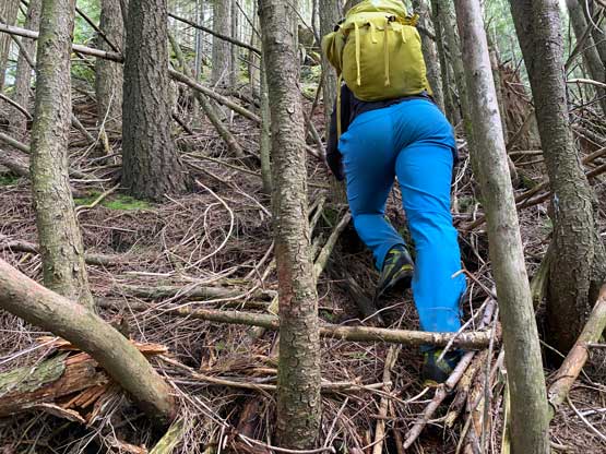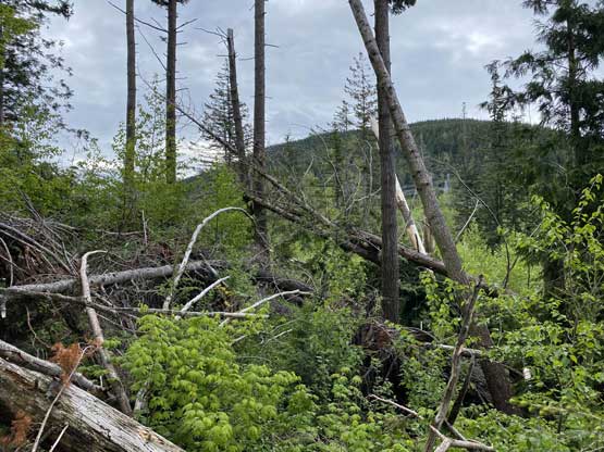 The spur road that goes up onto the west flanks of Mt. Hicks / “Sasquatch Peak” was in an excellent shape but unfortunately it’s gated meaning that those kilometers must be earned on foot. The road brought me to the south-west side of “Sasquatch Peak” near Sasquatch/Hicks saddle. I did not do my homework for this hike and ended up picking a rough route on the ascent. I naturally aimed for the highest possible spot on the spur roads before bailing into the forest. The last spur road was overgrown with wet bushes, and the forest was a true nightmare with “BW4” pick-up sticks and brambles. I should have just turned around to search for a better route because nobody mentioned such a bad bushwhack in their trip reports but I was too stubborn to turn around. After half an hour of hell I exited the worst of it onto the upper SW Ridge.