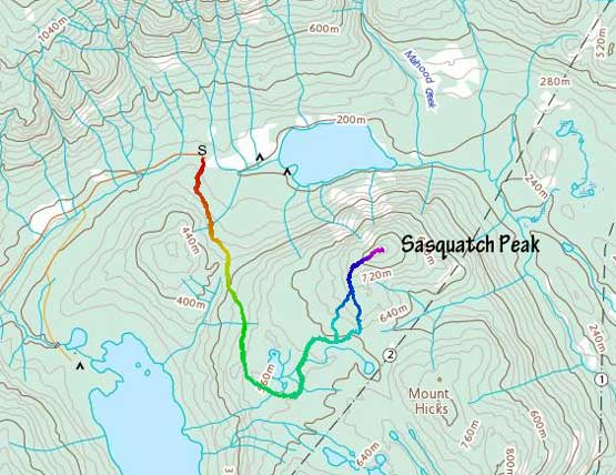 “Sasquatch Peak” is the unofficial name of the highest point of a small piece of woods immediately to the south of Sasquatch Provincial Park a short ways from Harrison Hot Springs. Despite the low elevation and the forested profile this peak surprisingly boasts over 600 m prominence as it’s surrounded by deep valleys. There are at least two small bluffs near the summit that offer some views on a clear day. Mt. Hicks to the south of “Sasquatch Peak” also in this same section of the woods is officially named but is lower and 100% forested with no view.