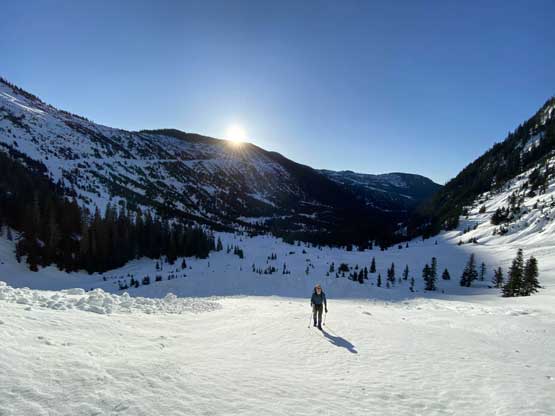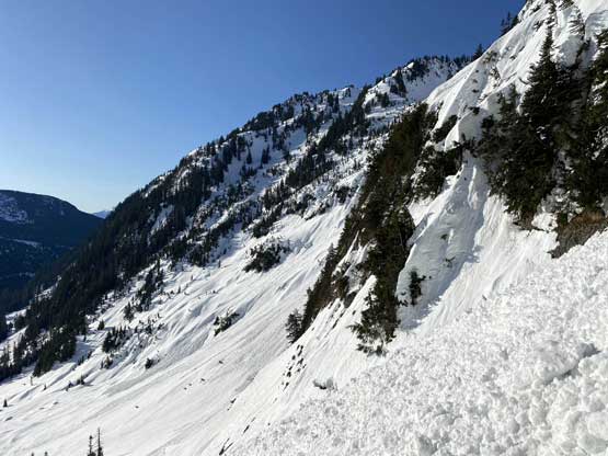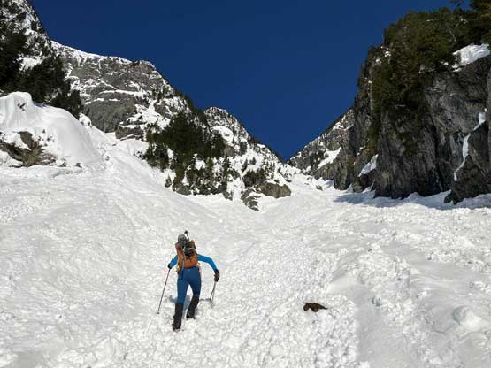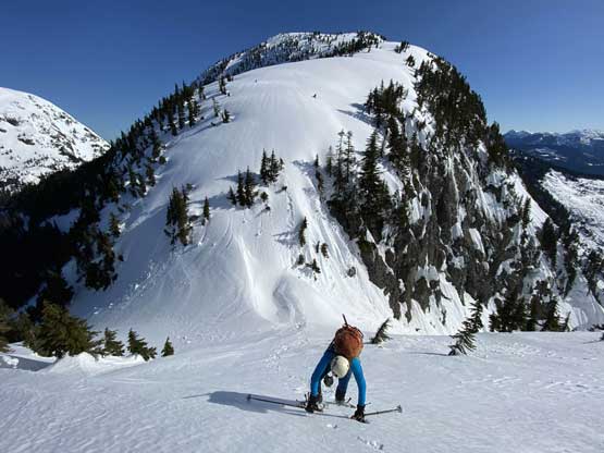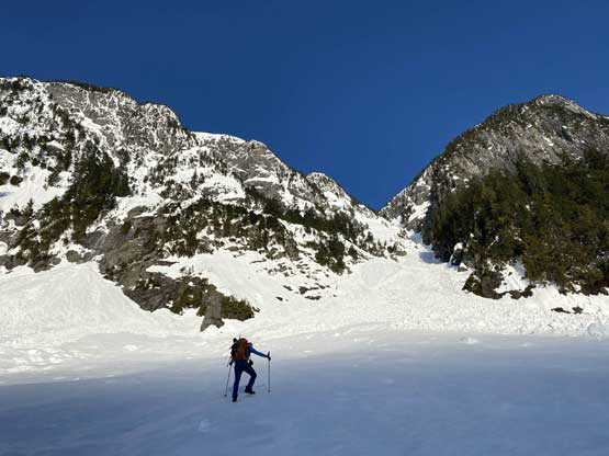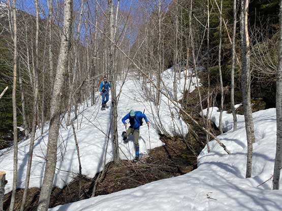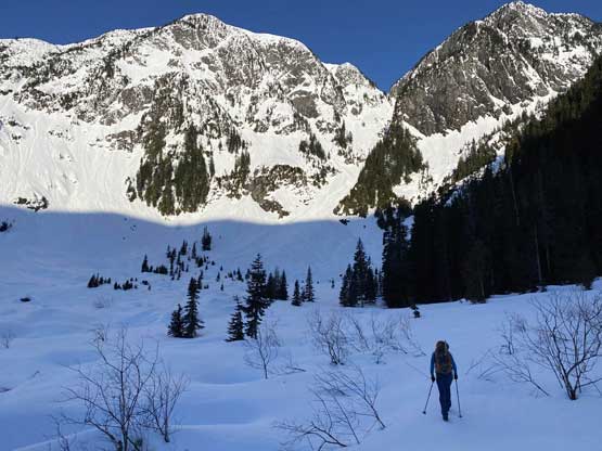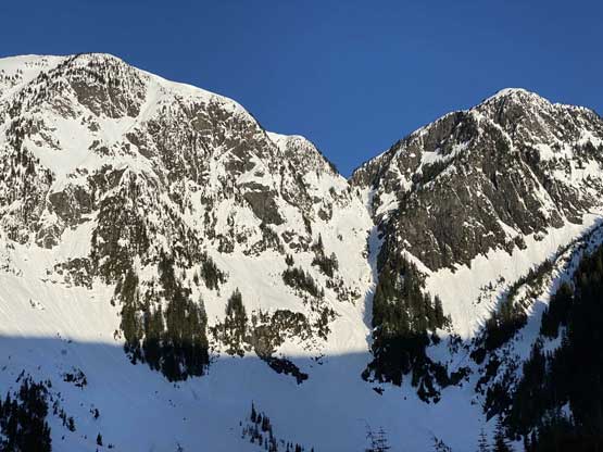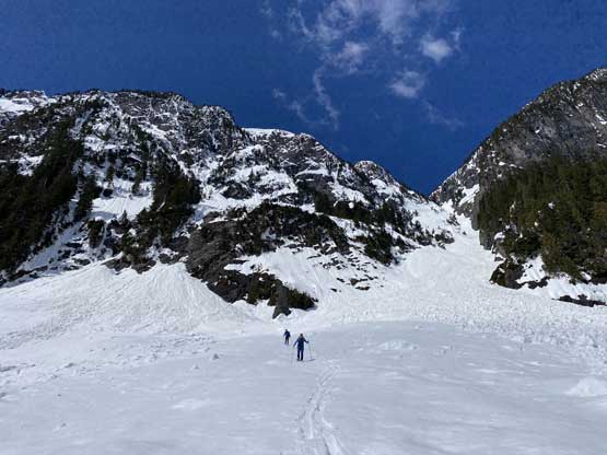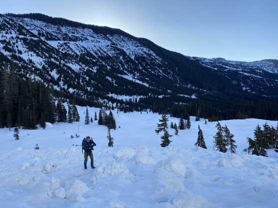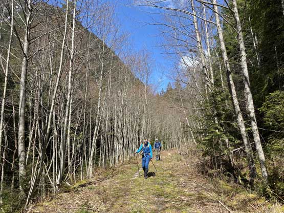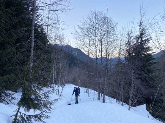 We were confused right off the bat because the road we drove was apparently not the proper Deneau Creek FSR. To access the actual FSR I led a short but steep bushwhack right from the vehicles. This had me further worried about the road conditions but it turned out to be in a much better walkable shape. There were even ATV tracks and generally speaking, we did next-to-none bushwhacking. We did make a critical mistake by taking a left fork (without realizing there’s even a fork), and didn’t realize this mistake until it was too late. Alex suggested we should just go to the end of this left fork road and hoping it somehow would connect to the main branch. Well, this directed us to a dead end and we were forced to bushwhack more than 100 vertical meters to regain the proper road. The bushwhacking here wasn’t too bad, but did cost us time. Once onto the main road the going was a cruise sailing with no bushwhacking thank to the rapidly thickening snowpack. There were dozens of annoying ditches that some even required us to jump across, but such pain was nothing comparing to the alder thrashing I was mentally prepared for. In under 2.5 hours since leaving the vehicles we made to the head of Deneau Creek valley. And I forgot to mention that we did not need to use snowshoes at all and were barely leaving a track on the snow, and this further confirmed that our timing was very correct.