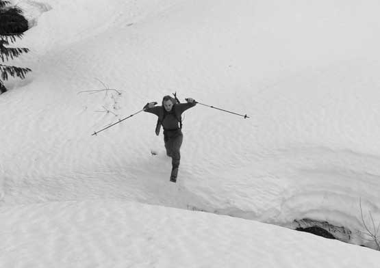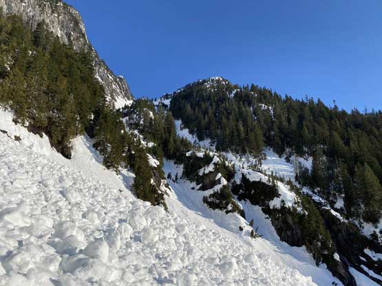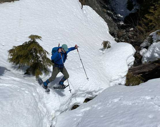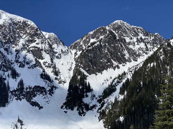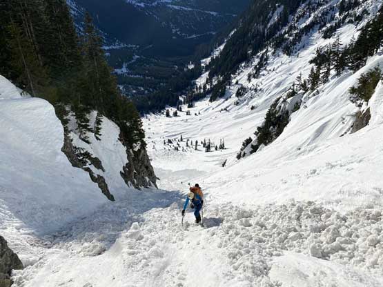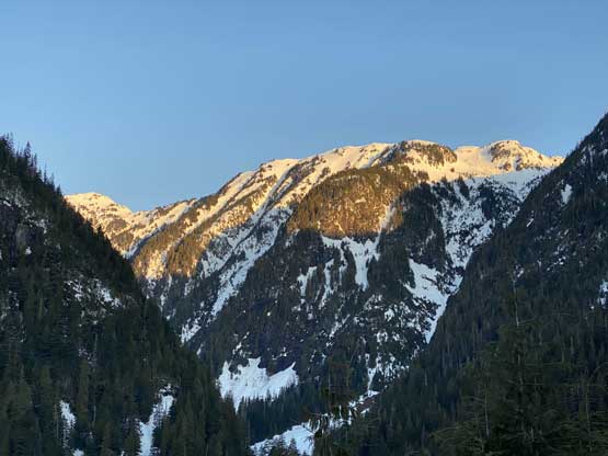We were worrying about the softening snow conditions on the descent so didn’t linger too long up there. The snowshoeing down to the couloir’s entrance was easy and fun. We continued snowshoeing down the uppermost section of this couloir until things steepened up and became icy. Swapping snowshoes for ice axes and crampons we were then in for a long, monotonous down-climb. For much of this gully we had to down-climb facing into the slope. There were chucks of ice coming down the side of the walls adding to the spice but there’s nothing moving inside the gully, as expected. A long while later the grade eased off and we walked down the avalanche debris like a drunk pair. Paul was actually sleeping on our transition spot. We took another long break swapping gears and then easily snowshoed down to the head of the valley, then onto the FSR. The rest of the descent on Deneau FSR was mind-numbing but uneventful. We did correct our mistake earlier in the morning by sticking to the main road and it was in a decent walkable shape with minimal alder thrashing.