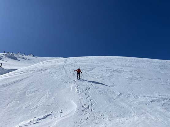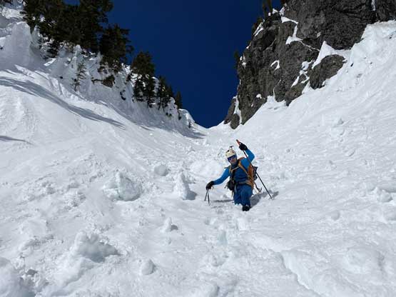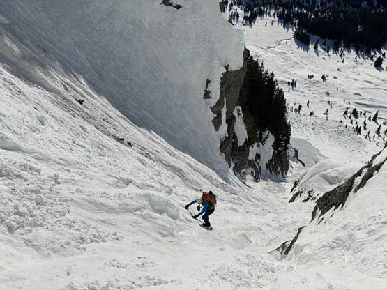 The gully appeared steep and daunting and our concerns now was actually whether one ice axe was sufficient enough for the job or not. It looked like we’d have to climb up some icy runnels. Nonetheless, Alex led us across the flats and walked up some avalanche debris to the gully’s entrance. We took the only break on this ascent here, baked in the sun and donning gears. I was very glad that I at least brought my ice climbing crampons instead of the hybrid ones. Minutes after starting the climb Paul realized one of his crampons broke and were forced to quit and wait for us at the gear transitioning spot by the gear failure. Alex and I continued charging up the increasingly steep gully, from 35 degrees to 40 degrees and probably close to 45 degrees on some short stretches. The condition was very icy at a few spots and having only one (aluminum) ice axe felt certainly undertooled, but at least I had the proper footwear so it wasn’t too bad. The going was slow but steady and the grade of the couloir wasn’t super sustained, nor the icy conditions. Hit some soft stretches for once in a while gave my calves some much-needed relief. The exit of this couloir was actually much mellower (30 degrees) but also held deeper snow. We were forced to don snowshoes about 20 meter below the top as the wallowing were knee-deep on breakable crust.