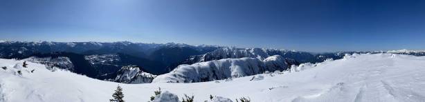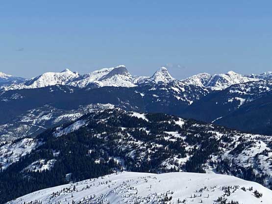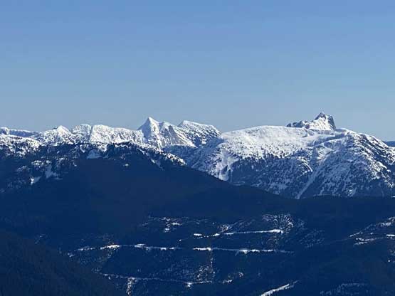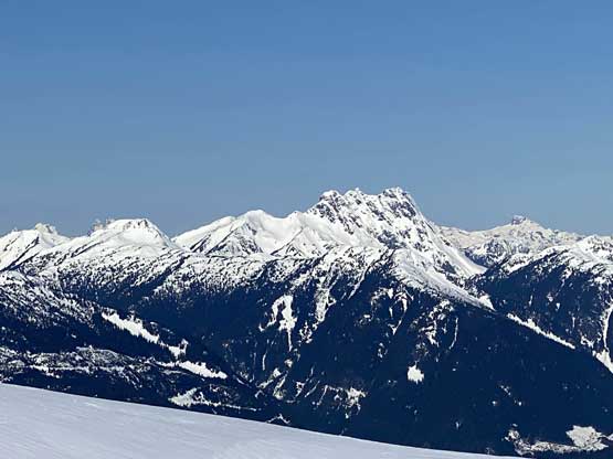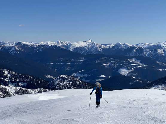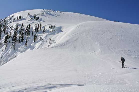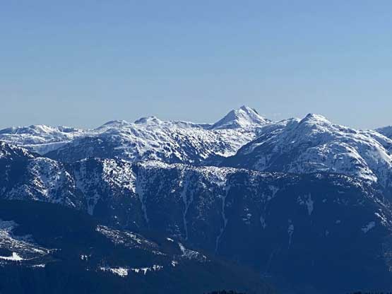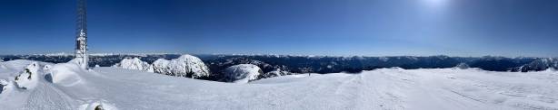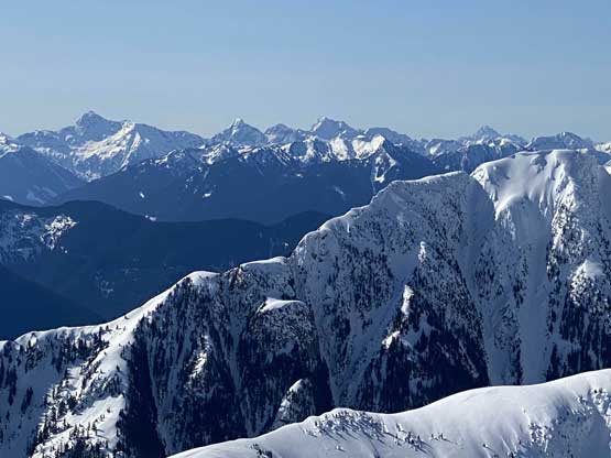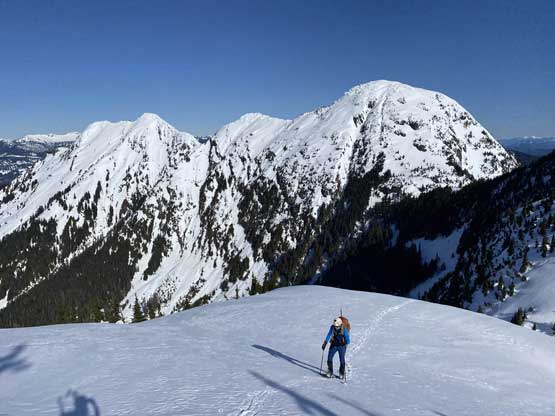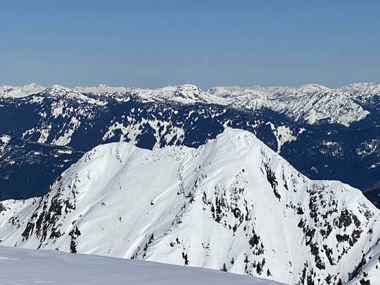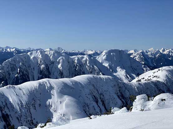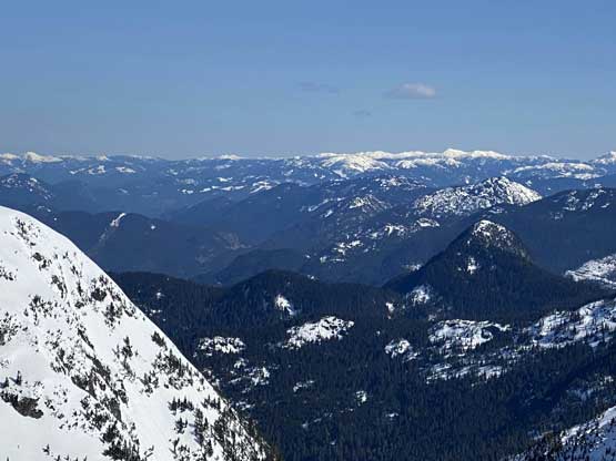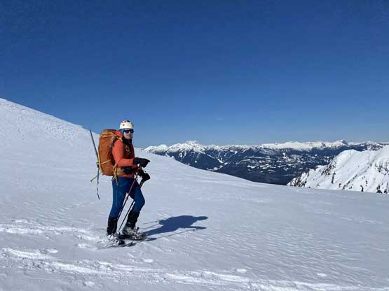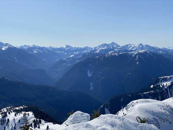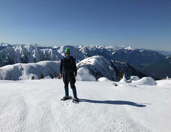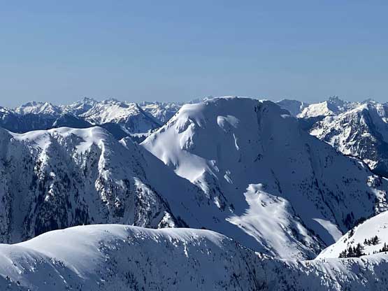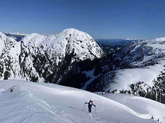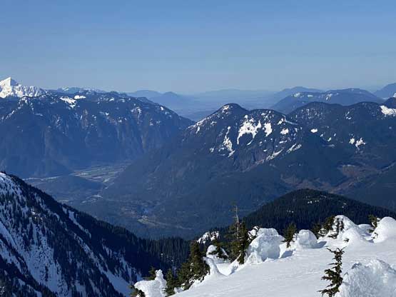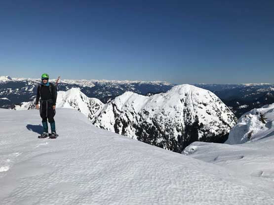 From the top of the gully we turned left onto the broad north ridge of Squeah Mountain. The ascent was not a piece of cake as I expected, and instead we still had to climb over some steep rolls, with one particular roll required me to take a snowshoe off. I was half-snowshoeing, half-bootpacking and believe me or not, such technique worked. There were some more 35+ degree stretches that required extra caution on snowshoes. The last 100 vertical meters to the broad, dome-shaped summit was much mellower though, and we actually had to walk around the flat summit dome to soak in all views. The best views were towards the north face of Jorgenson Peak and the town of Hope.