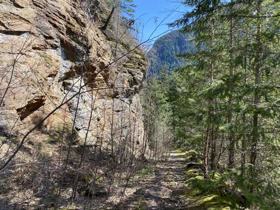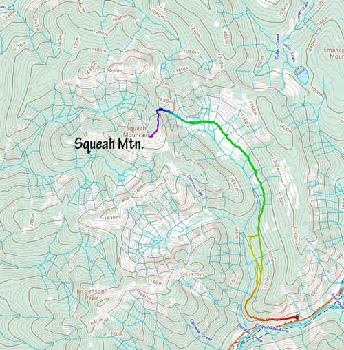 Sandwiched between Fraser River and Coquihalla Highway there are a few elusive summits immediately to the north of Hope, and Squeah Mountain is one of those. This group of peaks are known to have very few ascents despite their close proximity to civilization. They are guarded by steep, dense and somewhat impenetrable west-coast forest on all sides. There are logging roads running closer to the bases but those are all deactivated long times ago and the status is largely unknown in this modern era. About three years ago I explored the west side approach and bagged Jorgenson Peak and Ogilvie Peak in less effort than expected, but Squeah Mountain kept eluding me. The only access that makes sense is by the long-gone Deneau Creek FSR. The most recent trip report on ClubTread says “increasingly bushy for walking” and that was 7 years ago. The most efficient attack of the peak itself from the head of Deneau Creek valley is via the steep couloir on the east face. This couloir runs a east/southeast orientation, has over 400 vertical meters of run with sustained grade of around 40 degrees so timing is crucial. I had spent at least a few hours over the last several years looking for an alternative attack but couldn’t convince myself if there’s any better option. The wooded SE Ridge might look innocent on the topographic maps, but the access requires crossing the Deneau Creek’s slot canyon. This drainage is in fact, more famous for the out-of-the-beaten-path canyoneering oppourtunity than for climbing.