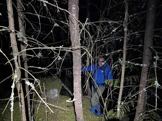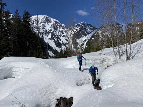 We were confused right off the bat because the road we drove was apparently not the proper Deneau Creek FSR. To access the actual FSR I led a short but steep bushwhack right from the vehicles. This had me further worried about the road conditions but it turned out to be in a much better walkable shape. There were even ATV tracks and generally speaking, we did next-to-none bushwhacking. We did make a critical mistake by taking a left fork (without realizing there’s even a fork), and didn’t realize this mistake until it was too late. Alex suggested we should just go to the end of this left fork road and hoping it somehow would connect to the main branch. Well, this directed us to a dead end and we were forced to bushwhack more than 100 vertical meters to regain the proper road. The bushwhacking here wasn’t too bad, but did cost us time. Once onto the main road the going was a cruise sailing with no bushwhacking thank to the rapidly thickening snowpack. There were dozens of annoying ditches that some even required us to jump across, but such pain was nothing comparing to the alder thrashing I was mentally prepared for. In under 2.5 hours since leaving the vehicles we made to the head of Deneau Creek valley. And I forgot to mention that we did not need to use snowshoes at all and were barely leaving a track on the snow, and this further confirmed that our timing was very correct.