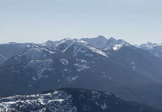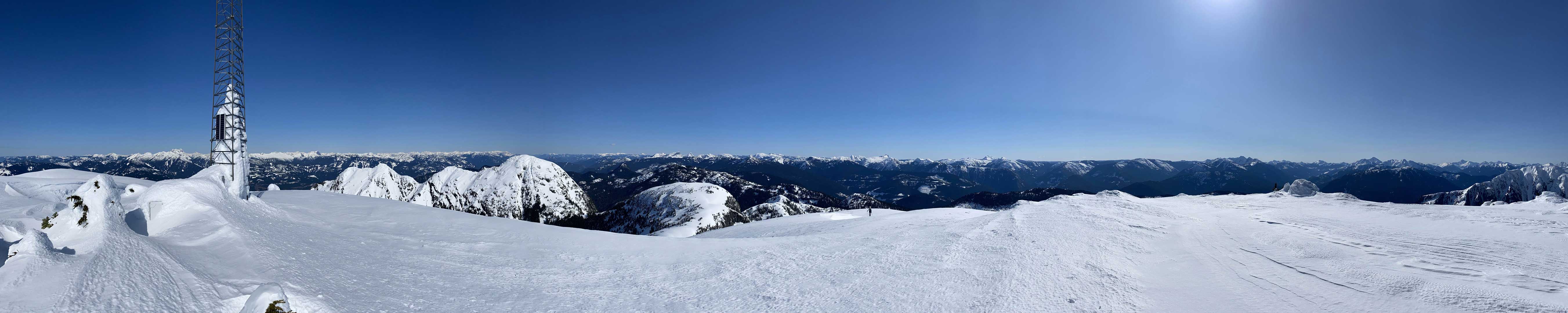 From the top of the gully we turned left onto the broad north ridge of Squeah Mountain. The ascent was not a piece of cake as I expected, and instead we still had to climb over some steep rolls, with one particular roll required me to take a snowshoe off. I was half-snowshoeing, half-bootpacking and believe me or not, such technique worked. There were some more 35+ degree stretches that required extra caution on snowshoes. The last 100 vertical meters to the broad, dome-shaped summit was much mellower though, and we actually had to walk around the flat summit dome to soak in all views. The best views were towards the north face of Jorgenson Peak and the town of Hope.
