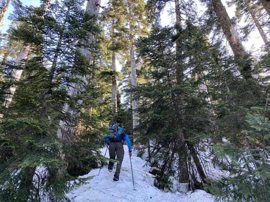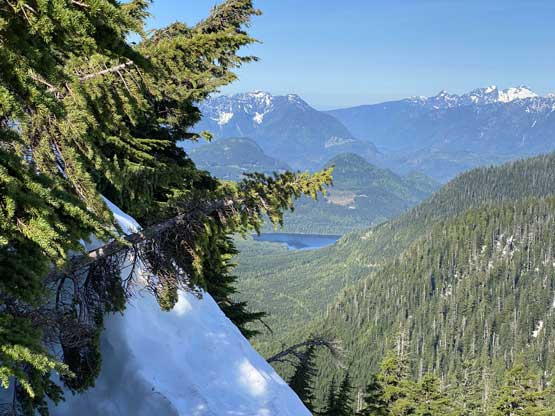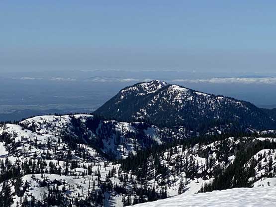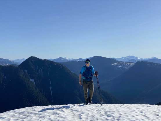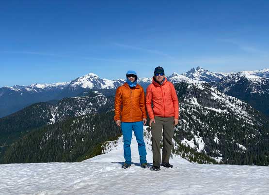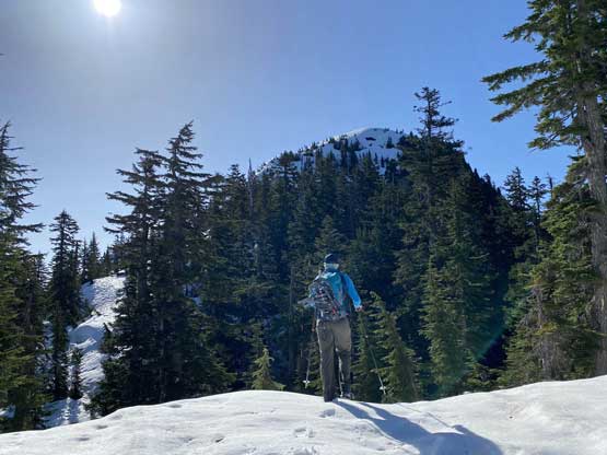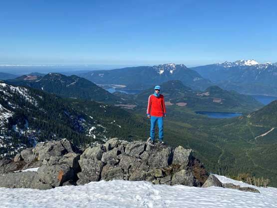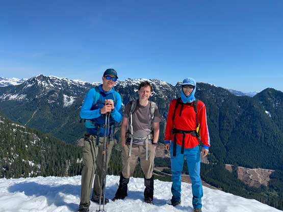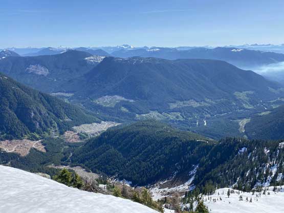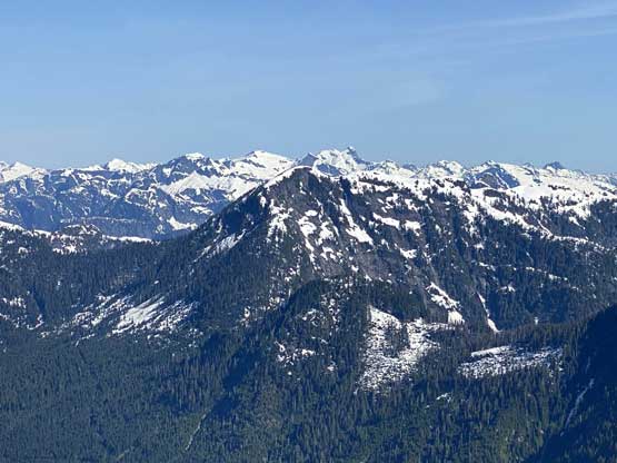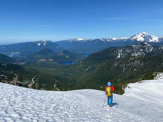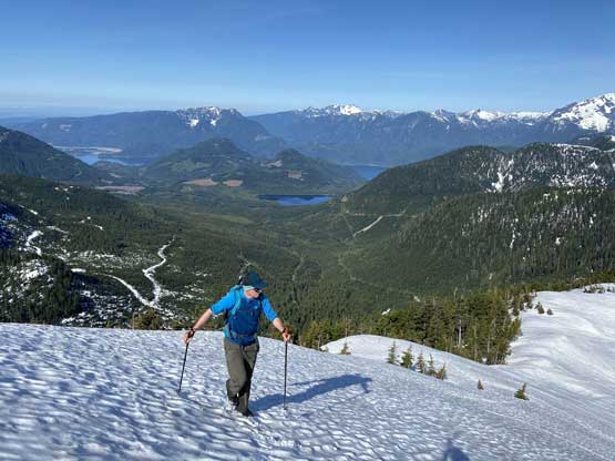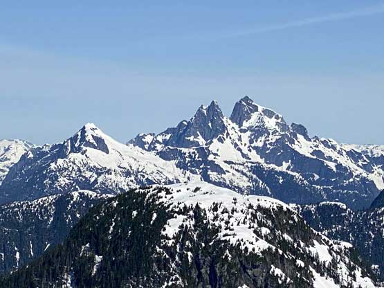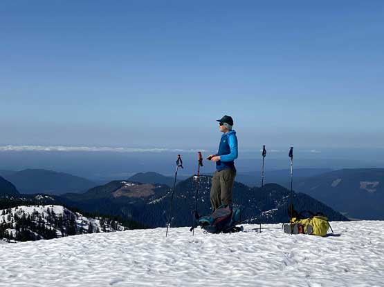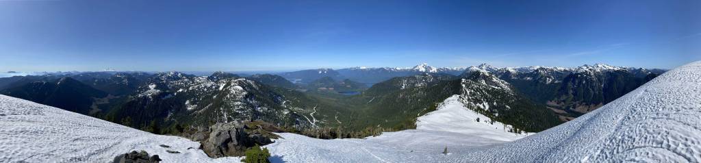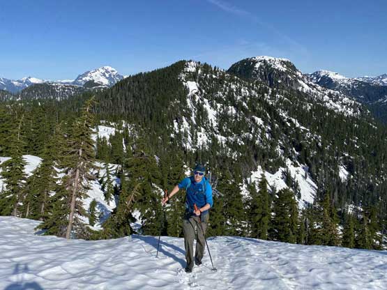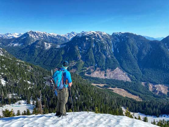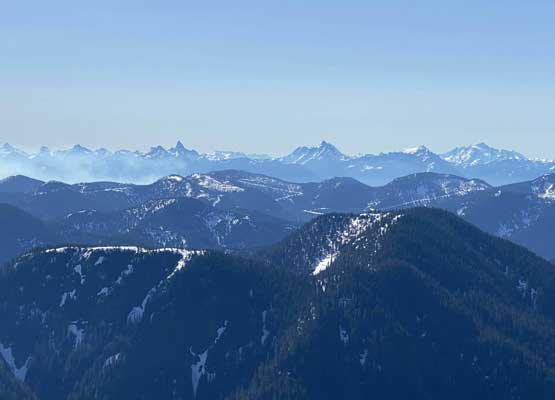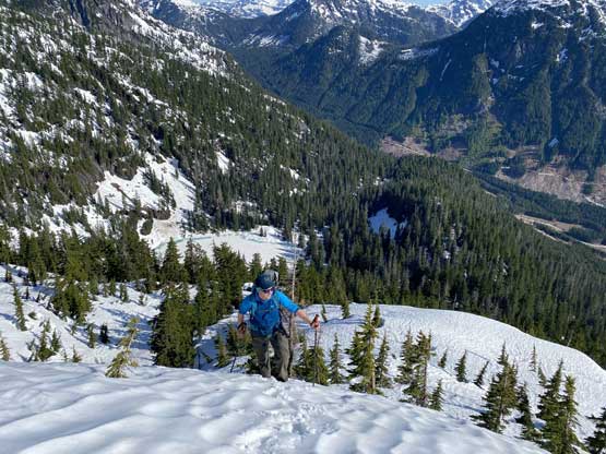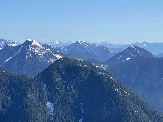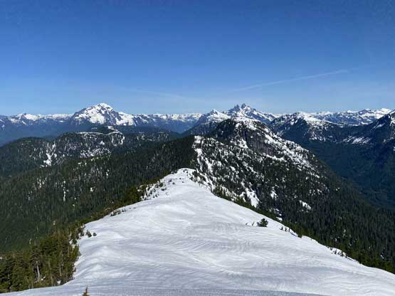 There was one steep roll (40 degrees) that required some careful step-kicking around several “tree moats” to pop onto the NW Ridge of “Statlu Peak”. After this roll the ascent to the summit was a cruise sail albeit with some foreshortened views. The ridge dragged on for quite a while. Other than carrying snowshoes for dead weight training I do think that we attacked this peak relatively efficiently. We earned ourselves a long break on the summit soaking in the views.