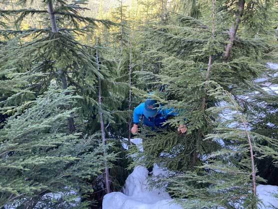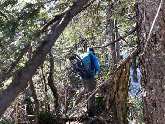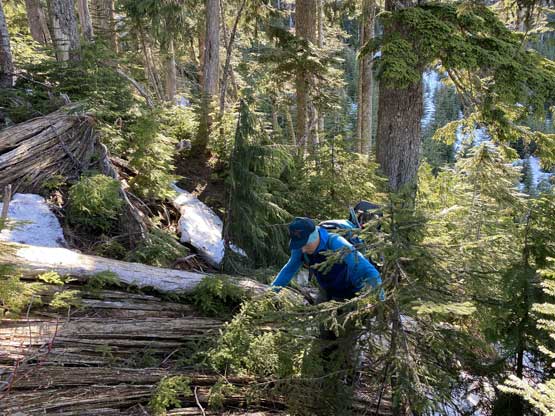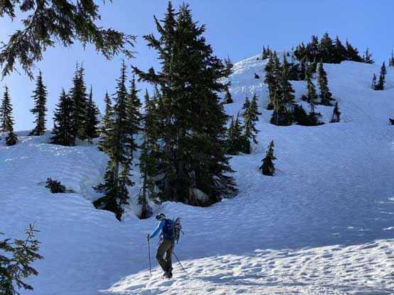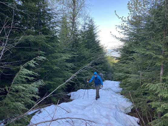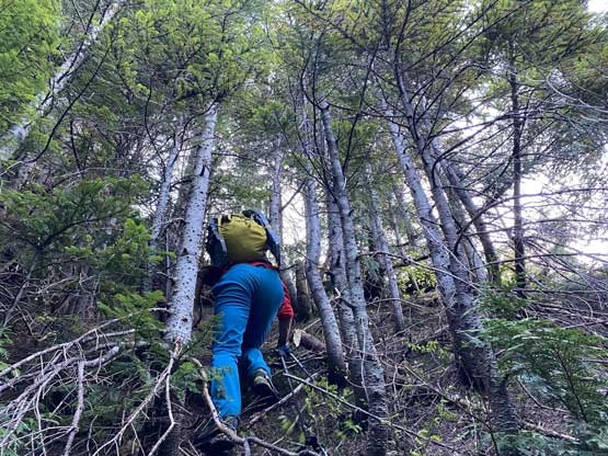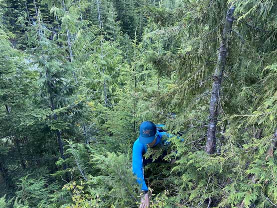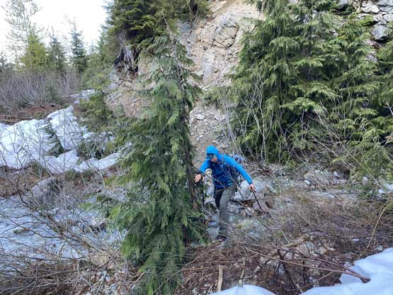 At 820 m we crossed another (minor) creek and between this one and the immediate next creek we were supposed to head into the forest to officially start the worst of bushwhacking. I didn’t quite understand why the previous group picked this line as if I were to choose, I would go further on the road and ascend the cut-block towards climber’s right. But since Carol’s line had been “proven” to provide a passage to the upper mountain we decided to stick with it and not fuss around with “other ideas”. The bushwhacking up the strip of forest between the two creeks was at the grade of sustained 3+ or 4- for at least 100 vertical meters. Even with some continuous snow patches higher up, the going was tight and slow. However, with perseverance we powered it through with some laughs and by 1000 m the going had become easier. From there to Kettley/Statlu col was mostly a steep ascent on snow. Traversing the ridge towards the NW Ridge of Statlu Peak we did have to briefly bushwhack but there’s nothing worth noting at this point.