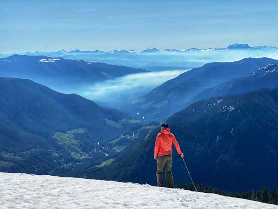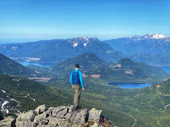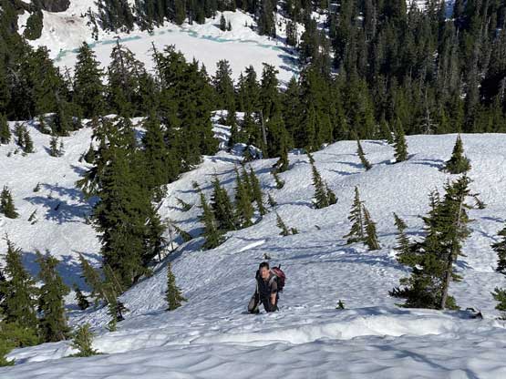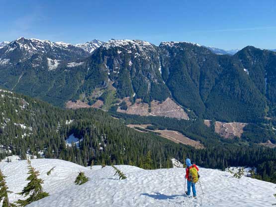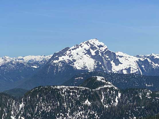 The descent of the upper NW Ridge was fast and fun and while descending that steep roll we noticed a solo climber going up. We soon recognized him as the fabled Simon C. in the local SW BC peak-bagging community. It’s been ages since any of us did a trip with Simon so we chatted for a while before resuming our own path. Simon had also noticed Carol’s trip report on peakbagger.com and decided to use the fresh beta to tag this otherwise, obscured and rarely-ascended summit. For Alex and I, the trip continued with an ascent of Mt. Kettley.