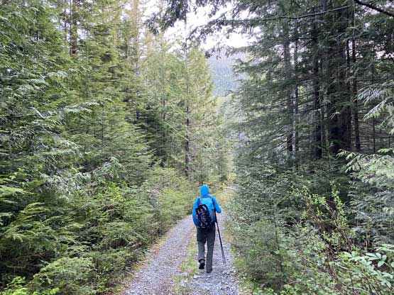 I wasn’t quite sure what exactly to expect so made the call to bring ice axe, crampons, snowshoes, mountaineering boots and river crossing footwear to make sure we could be 100% successful in the mission. A few pieces were proved to be critical but snowshoes were carried only for weight training. Alex and I met in Abbotsford at 5 am and drove up to Mission in my Tacoma. The going on Lost Creek FSR was smooth sailing until the last two kilometers before the spur turn-off, where the road degraded into a mess of pot-holes. Based on Carol’s words I expected to be able to drive a short ways up the spur roads and sure I went for the attempt. I didn’t get far but did dispatch over 1 km distance. I turned around and parked after crawling up a long stretch of boulders in 4Low. I did make a good decision to park as one downed tree and one major washout would have stopped my Tacoma from getting any further. A bigger vehicle might can push another kilometer further (bring a saw to cut that tree) but for us, there was no point in pushing further.