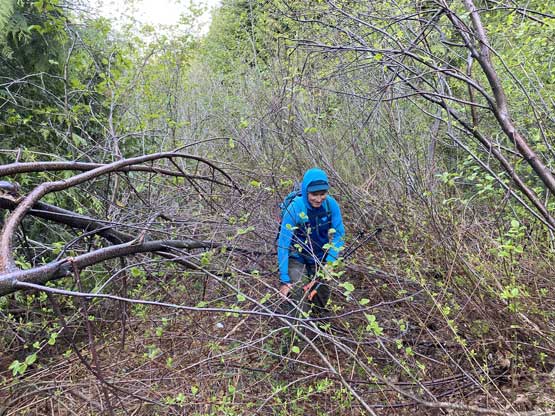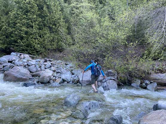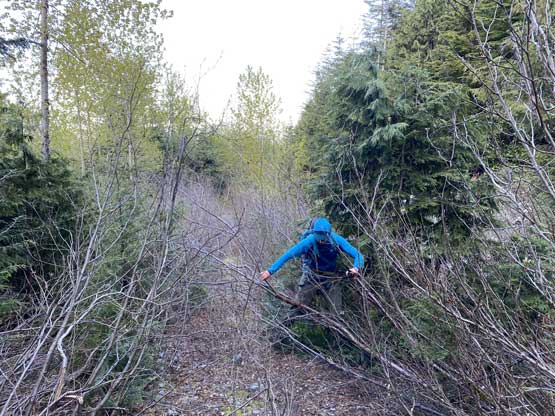I walked in trail-runners for the first few kilometers while carrying Trango Towers mountaineering boots, until the creek crossing. Carol and Dawn was able to rock-hop across but for us, wading was the only option. Good thing we brought crocs for that purpose. The fording was very straightforward. After the crossing I ditched the crocs and the trail-runners. The alders soon took over on the road but as Carol said, the bushwhacking was never that bad on this road (BW3- at the worst) and although we did have to constant push the alders the thickest sections weren’t very sustained. There were however, a few stiff brambles that surprised me and as a result, my arms and legs were full of scars now.