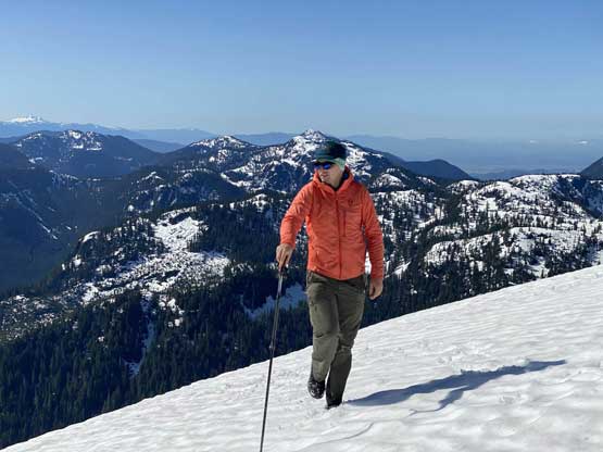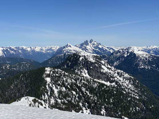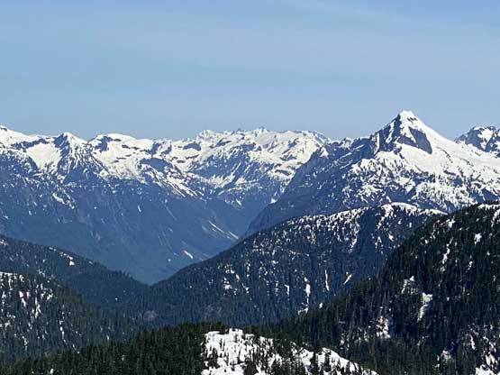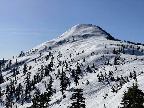 There was one steep roll (40 degrees) that required some careful step-kicking around several “tree moats” to pop onto the NW Ridge of “Statlu Peak”. After this roll the ascent to the summit was a cruise sail albeit with some foreshortened views. The ridge dragged on for quite a while. Other than carrying snowshoes for dead weight training I do think that we attacked this peak relatively efficiently. We earned ourselves a long break on the summit soaking in the views.