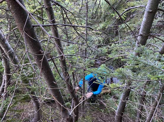 At 820 m we crossed another (minor) creek and between this one and the immediate next creek we were supposed to head into the forest to officially start the worst of bushwhacking. I didn’t quite understand why the previous group picked this line as if I were to choose, I would go further on the road and ascend the cut-block towards climber’s right. But since Carol’s line had been “proven” to provide a passage to the upper mountain we decided to stick with it and not fuss around with “other ideas”. The bushwhacking up the strip of forest between the two creeks was at the grade of sustained 3+ or 4- for at least 100 vertical meters. Even with some continuous snow patches higher up, the going was tight and slow. However, with perseverance we powered it through with some laughs and by 1000 m the going had become easier. From there to Kettley/Statlu col was mostly a steep ascent on snow. Traversing the ridge towards the NW Ridge of Statlu Peak we did have to briefly bushwhack but there’s nothing worth noting at this point.
