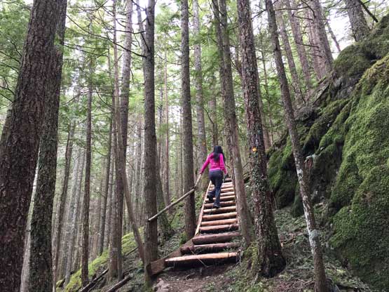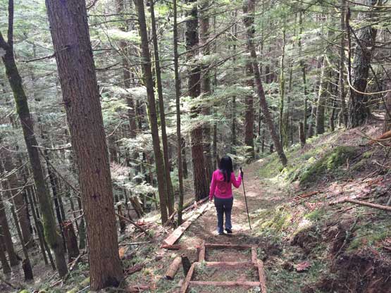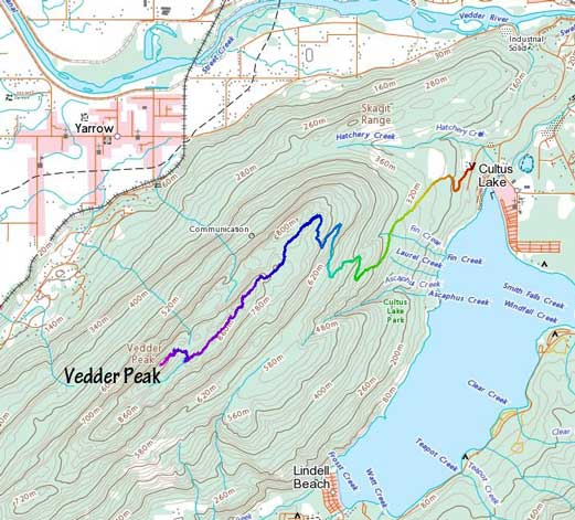 Vedder Peak is the highest summit on the long ridge of Vedder Mountain that runs from Chilliwack, B.C. all the way into the state of Washington. This is not a “sexy peak” by any measure as much of the hill is heavily wooded and the woods are mostly secondary growth thank to the heavy logging activities. There is however, a decently maintained trail that runs from a high parking lot (~600 m elevation) all the way to the summit. Those without a high clearance vehicle will need to park at the lower parking lot adding about 20 minutes of walk each way. I figured a peak like this could be easily done by my “morning exercise” routine even while taking a newbie hiker out.