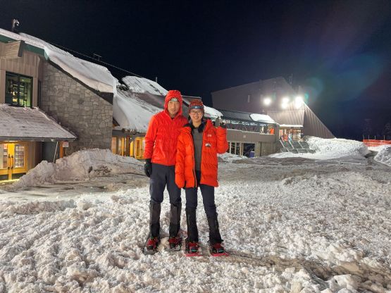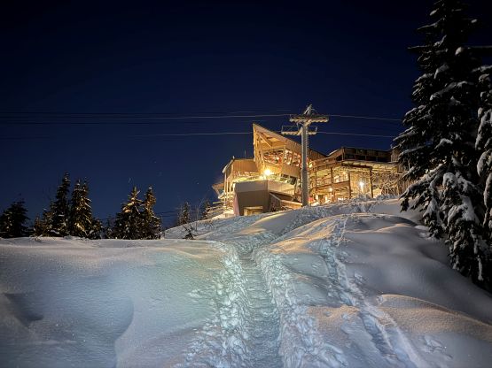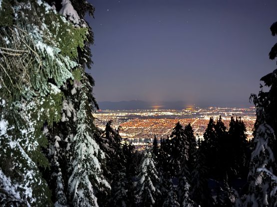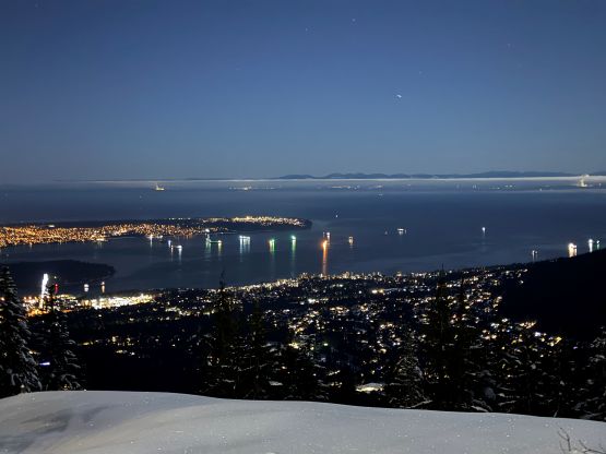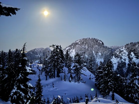 The Grouse Grind was closed for the winter season so most parties would take the BCMC trail. I had only done the BCMC trail once and that was also in a winter trip back in 2016. I do not have a standard Grind/BCMC time but I anticipated somewhere around 1.5 hours for the 800 m gain. The trail was vastly different from what I remembered as they had apparently engineered the BCMC trail with a shit ton of staircases just like the nearby Grouse Grind. This was not the case back in 2016. In terms of the gears we carried snowshoes, crampons and 3 ice axes among the two of us. I also opted to carry Clair’s snowshoes (well, technically my spare pair of Lightning Ascents) to lighten Clair’s loads so I had 4 snowshoes strapped to my pack. The start of the trail was very confusing as there’s a massive closure sign. We ended up taking a short-cut but judging from the tracks most people must have started from the official (closed) trail-head. The entire trail was covered in snow but microspikes were not needed. There weren’t much worth noting beside counting the trail markers, and we eventually got to the top of the gondola station in 1 hour 35 minutes almost exactly as planned. I do not think the markers were scaled evenly as 25/50 was way beyond the halfway point from either elevation or distance perspective. We did a quick transition to don snowshoes at the top of the gondola station and but then had to keep moving, as we were in the middle of an Arctic outflow event with some blustery cold winds. But on the other hand, the bright full moon made for some cool night scenery. I was unable to pick up the correct snowshoe route so simply led us plodding across the ski runs to the base of Grouse Mountain, and then picked up the road/trail traversing towards Dam Mountain. We then opted for the “up and over” option and summitted Dam Mountain in the dark.
