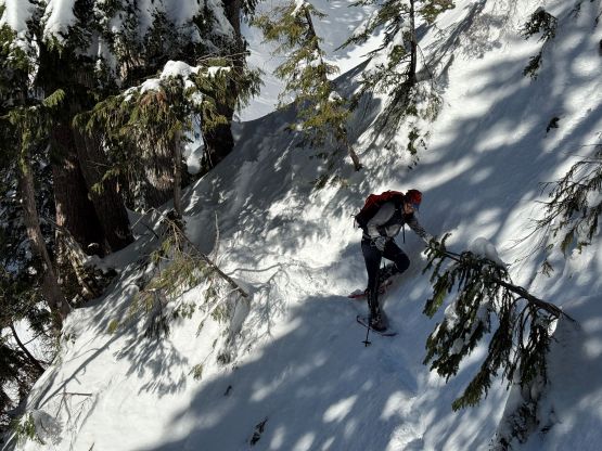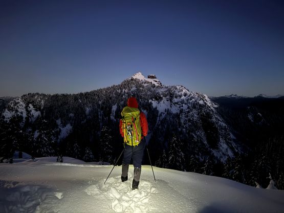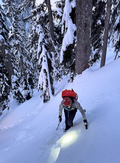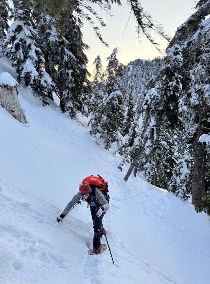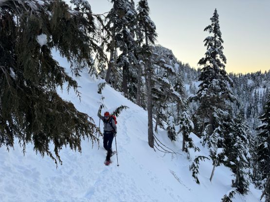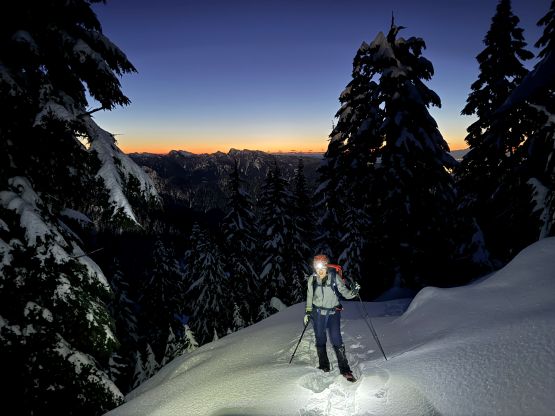 Plodding past the seasonal (winter) closure sign we quickly dropped down into Dam/Little Goat saddle and then picked up a set of snowshoe tracks traversing around the east slopes of Little Goat Mountain. Whomever made that track was not the greatest at route-finding, but this track did save us about 20 m elevation gain by not summitting the very top of Little Goat Mountain. We then followed the snowshoe tracks down to Little Goat/Goat col looking down at the 250 m descent to Crown Pass. It was still in the pitch dark but the horizon was starting to lighten up. Unfortunately the snowshoe tracks continued towards Goat Mountain so we had to our own route-finding and break our own trail down to Crown Pass. Without daylight the navigation was mostly done by GPS but I did think we stayed mostly on route. The descent was definitely strenuous but not as steep as I remembered from the summer trip to Crown/Camel/Spindle back in 2017, and the soft and deep powder made for some ideal downhill snowshoeing conditions. Without doing much lingering we immediately started the grunt up Crown Mountain’s south face, roughly following the summer route at least for the lower portion. The steepness of the terrain combined with the unconsolidated snow made for some tiresome trail-breaking, but it’s manageable and the effort was not that insane after all. I led us grunting up a shallow gully and then made a somewhat exposed traverse to the climber’s right following some markers. We then did a rising traverse in the thinning forest towards climber’s left and slowly abandoned the summer route. I thought the slabs section of the summer route would be too exposed/open for Clair so I made our own route by cutting a continuous side-hilling traverse about 50 m lower than the summer route. It was still very steep but at least the exposure was manageable.