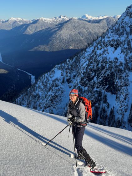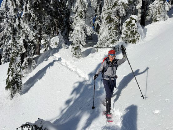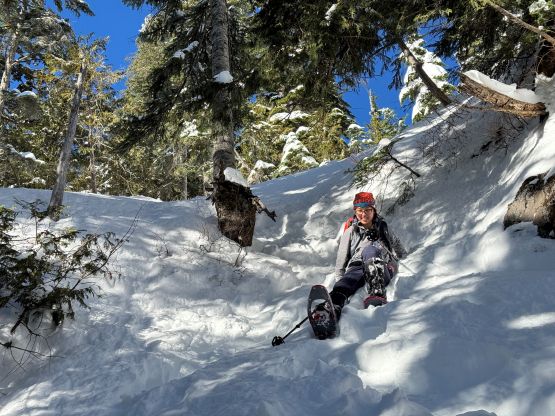 After crossing the central south face’s gully we encountered the first crux zone. The area appeared steep from below and turned out to be insanely steep indeed. I was barely able to make my way up without having to take the snowshoes off so this was quite a struggle for Clair. Thankfully there were some tree branches providing some much needed vege belaying. For the next while I tried to make as much traversing as possible without doing too much straight-up ascending. The purpose was to minimize the amount of up-and-downs once hitting the connecting ridge between Crown Mountain and “Beauty Peak”. In the end we did do less up-and-downs than the summer route but not with significant amount of difference, and we encountered more side-hilling that put our snowshoeing skills in test. Descending towards Crown/Beauty col we encountered the second crux zone that made us taking the snowshoes off. There was about 10 m of 50+ degrees of down-climbing with some exposure to the sides. I thought it would be better to deal with the unknowns on foot, and it turned out to be waist deep wallowing facing into the slope. We made the reascent on snowshoes an hour or two later but we struggled even more on the return. This was just a challenging step that does not offer a simple, obvious solution. The 100 m grunt up the east slopes of “Beauty Peak” was tiring but without event and we eventually made the summit at 9 am. The views were excellent so we needed to take our time wondering around. We had come to the realization that Clair would definitely be late but that’s not completely unacceptable as she’s very smart. I told Clair there’s nothing to worry about as I personally had skipped many days (not just one class) including at least one lab for climbing trips during the university time, and still managed A or A+ in those courses.