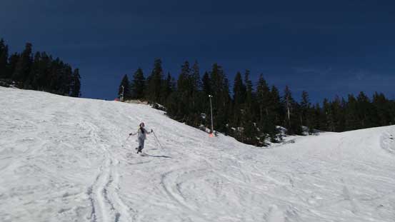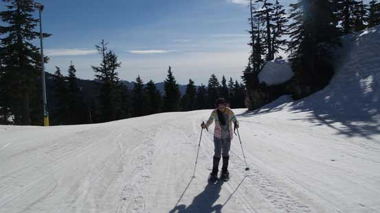 My original plan for the descent was to follow the primary green run but Cathy was doing actually pretty good on the snowshoes so we figured might as well just go down a “blue run”. The slushy snow was super fun to plunge and we got down in literally no time, having lots of fun gliding (although I really wished to have my skis on).
