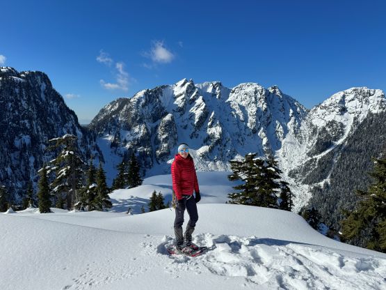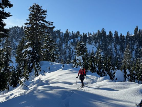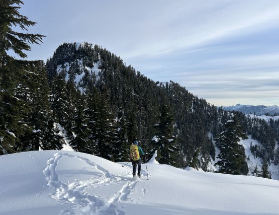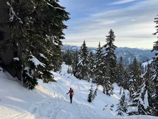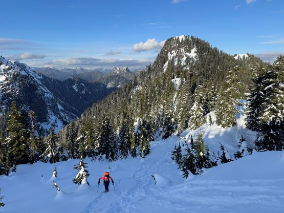 The tracks up towards Goat Mountain turned out to be terrible as whomever made that set of tracks had apparently opted to descend on foot, totally destroying the snowshoe tracks. I don’t know how is that possible for someone’s snowshoeing skills to be that horrible to opt for such deep post-holing. The snow condition was basically all time prime for snowshoeing as it’s not firm at all. To snowshoe on top of their post-holes was awkward but was still better than breaking our own trail. I led us bypassing the uppermost 50 m elevation gain to the very top of Goat Mountain by cutting across the steep south face. Holly was not very keen on that, but my route worked out well. And as expected we were on our own breaking trail afterwards. The amount of undulating terrain on Goat Ridge exceeded my expectation but the views were great and the trail-breaking wasn’t too bad. I tried hard to avoid plodding up and over those bumps so did a lot of side-hill cutting and I think I picked a good line to the junction between “Forks Peak” and “Goat Ridge Peak”. What laid ahead would be the 250 m adventurous descent into the deep Goat/Forks saddle but this was what we came here for. I was actually quite excited. The steep descent could be broken into two stages with one section of flat ridge in the middle. The crux was definitely the second stage but we ended up doing one rappel on each stage. The first rappel was mostly due to my impatience and could be totally avoided. I also kind of wanted to rappel as I sold this trip to Holly by promising that we would be making some rappels on snowshoes and this would be the first time for any of us doing that. Elsewise we were able to keep the snowshoes on, but the grade and condition was pretty much on the borderline of what could snowshoes handle. This really put my route-finding and snowshoe down-leading skills in test.