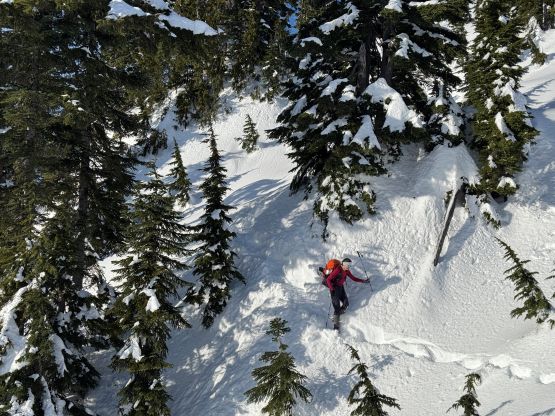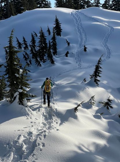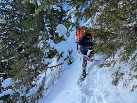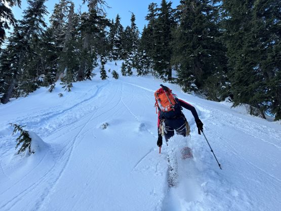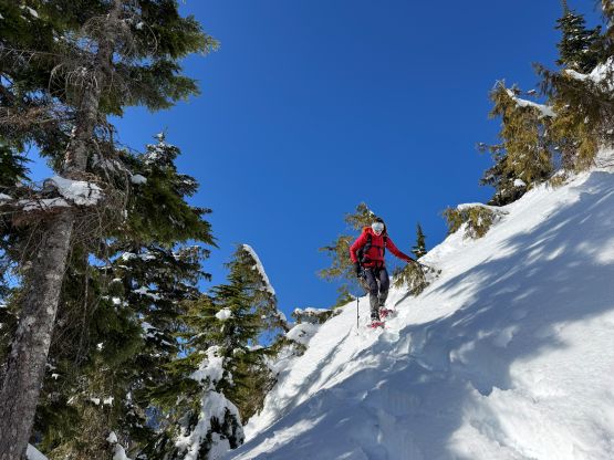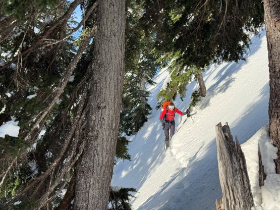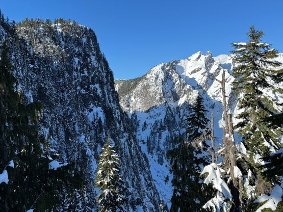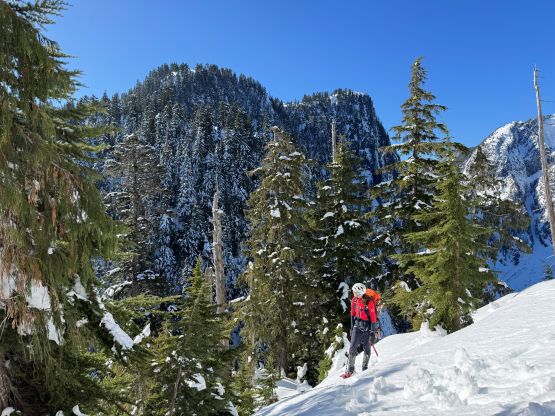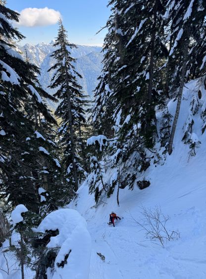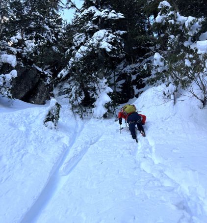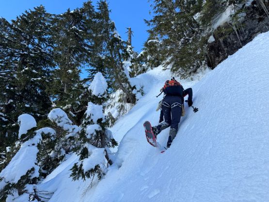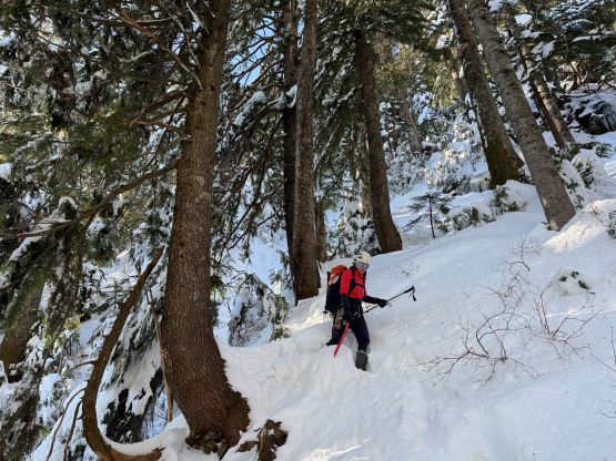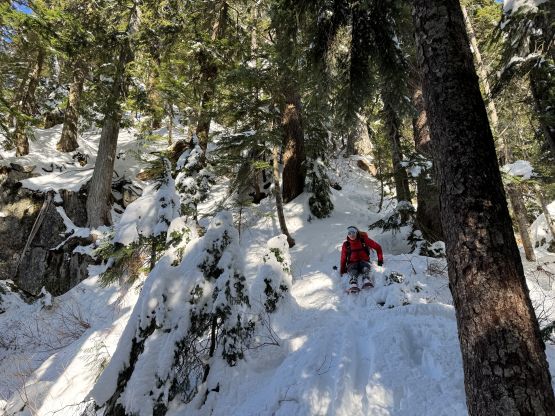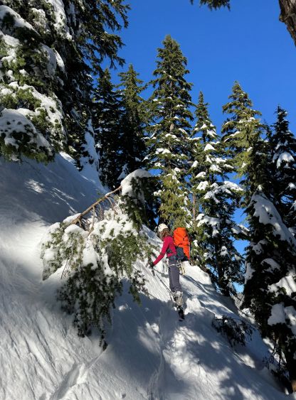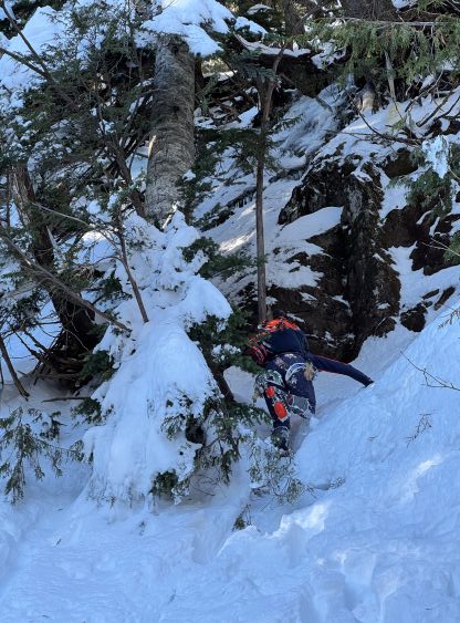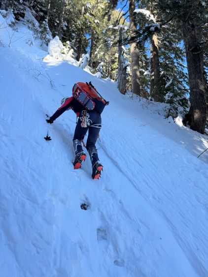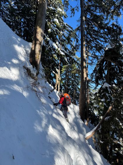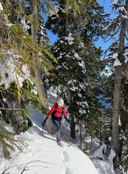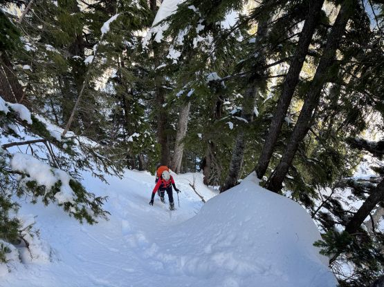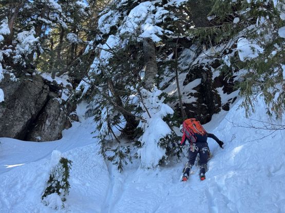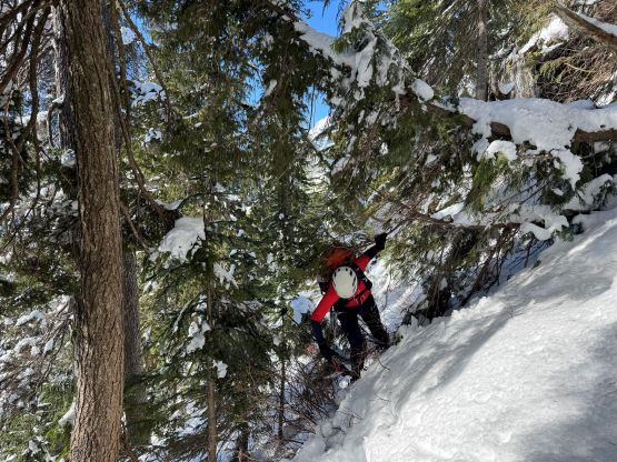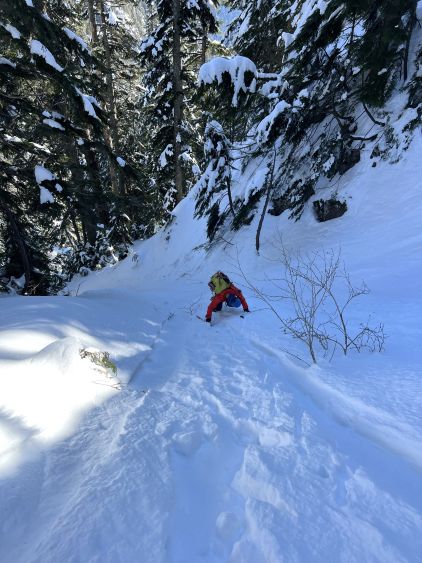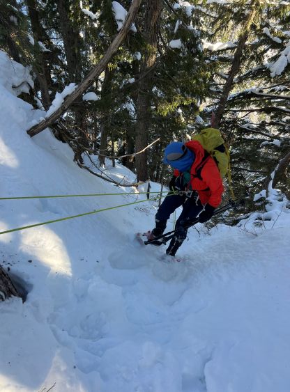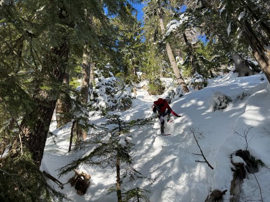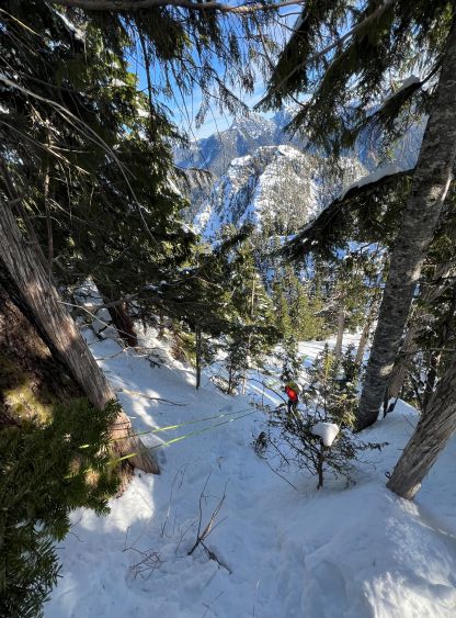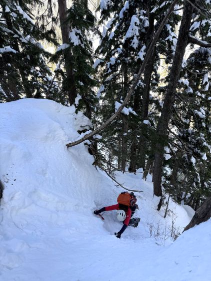The second stage was considerably steeper than bluffier than the first and right off the bat I had to make several backtracks (which I rarely do) unless we wanted to make several unnecessary rappels. I knew we had to keep a skier’s right bearing but the correct route always existed on the left (cliff) side followed by taking a traverse on some ramps. This got me confused several times. The crux step was done by rappelling and I think we made a good choice, as otherwise we would have to switch gears to crampons and ice tools. We then encountered a long, steep and exposed traverse and about halfway across I made us don crampons. The consequence of slipping on snowshoes on this 45-degree terrain was disastrous and the down-leading on snowshoes was getting to my comfort limit. It was not any easier to lead across this traverse on foot due to the deep snow. For a few times I sank waist deep but that’s the only safe way to make this happen. This traverse brought us to a gully and it’s obvious that we had to downclimb this gully for a ways. This required facing into the slope and for a few steps I wished to have taken the second ice tool out. We picked a better line on the return, but the route I picked on the way down involved a few thin moves on ice and mixed terrain. I then led us traversing skier’s left back into the forest and made some deep post-holes down to Goat/Forks saddle.