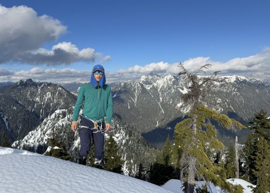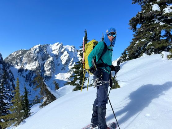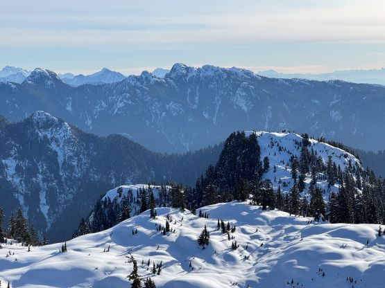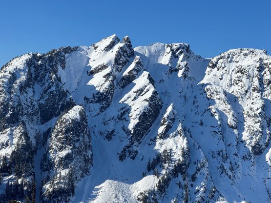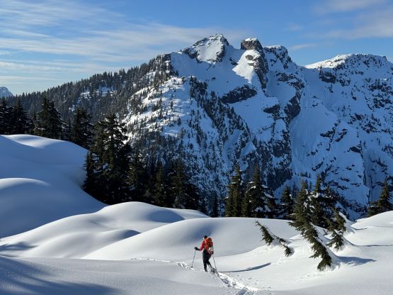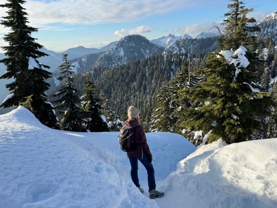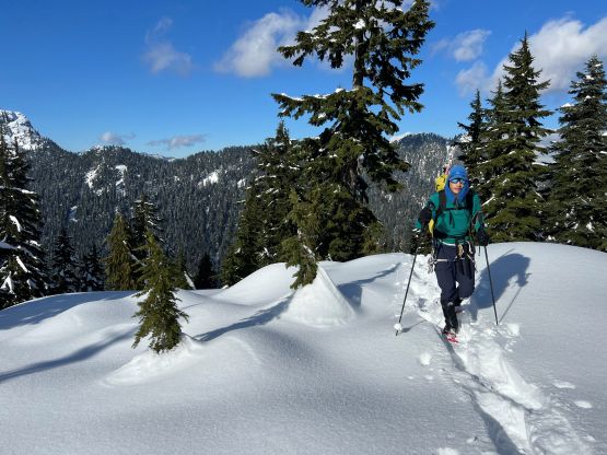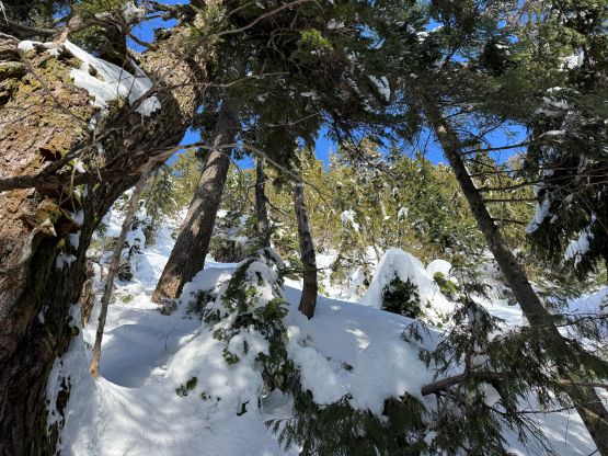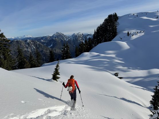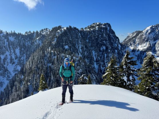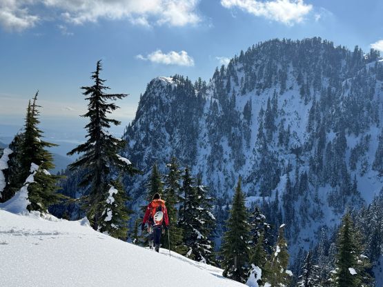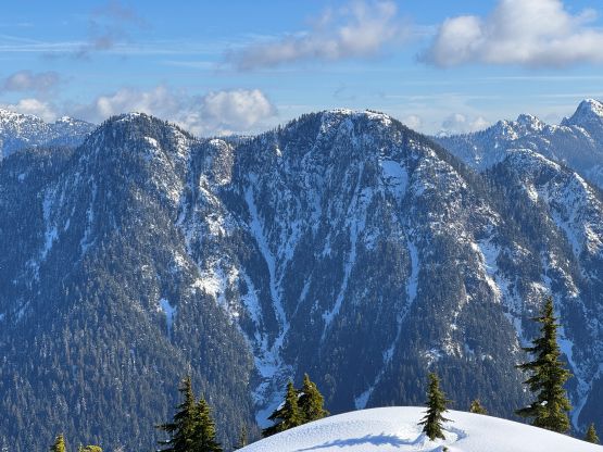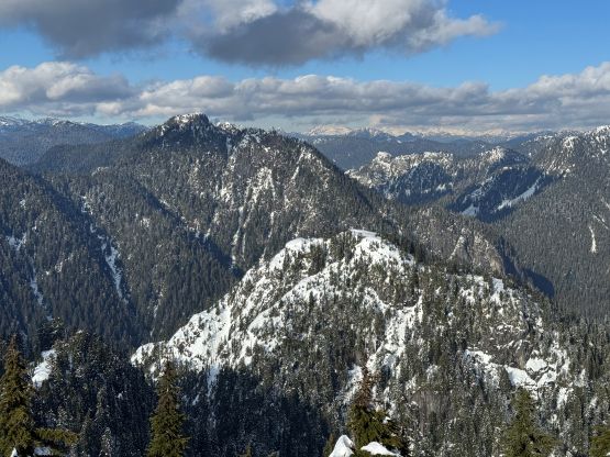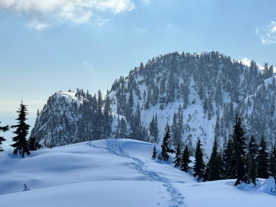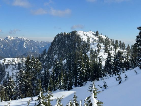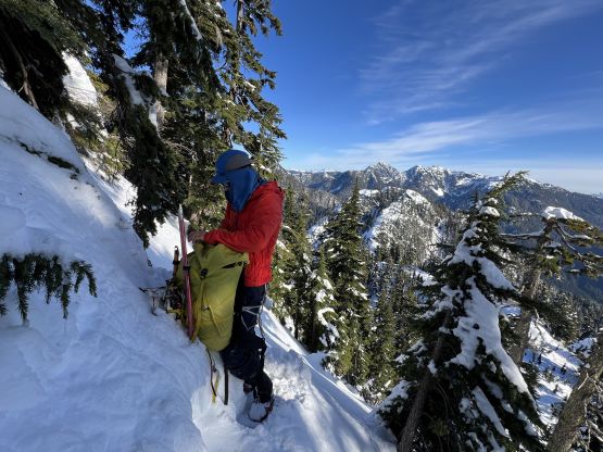Due to laziness I opted to continue post-holing up towards the other side. It would make far more sense to switch to snowshoes but I remembered from that bivouac.com report that the terrain was “50 degrees”. We encountered perhaps 10 meters of a slope of that grade but that’s about it. We ended up descending this entire ridge on snowshoes an hour or two later and had no issue with that. About 100 m up I was constantly sinking waist deep and made the call to do another gear transition. Holly and I then took turn breaking trail on snowshoes. Holly actually volunteered to lead what appeared to be the crux of the SW Ridge of Forks Peak, and the wallowing on the 45-degrees unconsolidated snow took a long while. I eventually took over the lead and got us through that stretch by pulling on vege. The rest of the ascent was still tiring but not technical. This peaklet offered surprisingly good views especially towards the east faces of Crown Mountain and “Spindle Peak”, and therefore it’s not a dumpster objective by any measure.