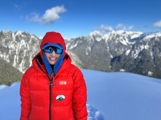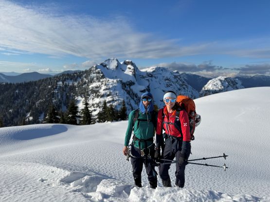 There’s good cell coverage on the summit so I made a few updates to inform various friends about our progress. Holly was still keen on her “mountain meditation” but I didn’t approve that. Instead I thought we had to hurry up especially that my phone’s battery had dropped to below 50%. I did not bring a battery pack and I had to count on the phone for a lot of things (well, almost everything). The descent to Forks/Goat saddle was quick and entirely done on snowshoes, and then I even managed to lead us halfway back up the lower crux zone on snowshoes before being forced to switch to crampons. There were at least two steps in addition to that traverse that required crampons, and with the existing tracks the post-holing was actually not that bad. To climb up the section that we had rappelled was harder than I thought. I was originally going with only crampons and trekking poles but halfway through that section I had to take both of my ice axes out. There were a few moves on thin snice and the grade was at least 55 degrees. Holly did fine without asking for a belay. As mentioned earlier we avoided the second transition by finding an easier alternative around that upper rappel, and grunted back up to Goat Ridge on snowshoes. Holly had done “Goat Ridge Peak” many years ago so she opted to take her “mountain meditation” while waiting for me snagging that meaningless summit. I had to manually set the filter of my peakbagger app back to “zero prominence” to even find this dot. The only reason that I bothered with it was the inclusion in the Baggers’ Challenge so it’s sort of getting popular these days. I do not consider this as a “peak” otherwise, and despite the inclusion in the list it does not go on my personal count.