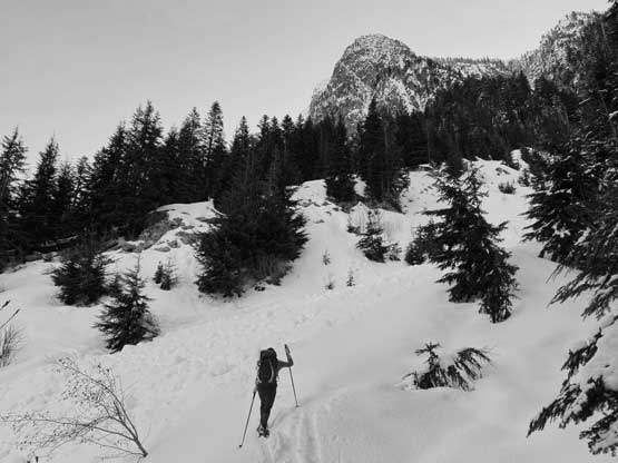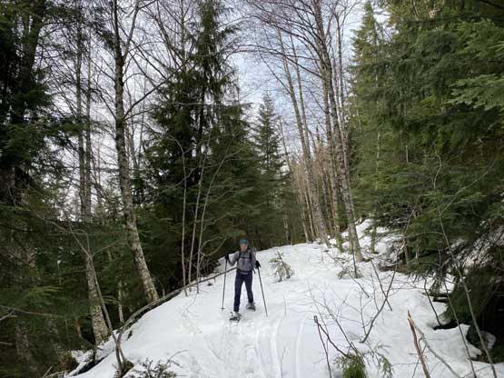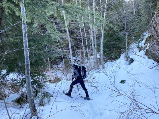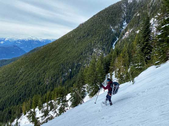 In terms of technical gears we brought one 60m rope, a small rock rack, 3 pickets and lots of slings as we anticipated abundance trees for natural protections. We unfortunately had to carry snowshoes as the snowpack hasn’t fully transitioned into spring mode yet and my pack’s weight was over 35 lb at the start, a wee bit heavy for a day-trip. Winnie and I left Vancouver around 6 am and started the plod before 7 am. The parking at Lions Bay was not a problem in the early morning hours. There’s very little worth noting about the first few switchbacks up the deactivated logging roads to the Magnesia Creek spur junction. We took the left branch and soon encountered patchy and then continuous snow. The snowshoes were strapped on at around 750 m elevation and the start of the gully was at 900 m elevation. We snowshoed a few hundred meters up the low-angled lower portion of this gully. About 15 cm of low density fresh snow had accumulated on top of the hard-as-fuck avalanche debris and the snowshoes definitely helped our ascent.
