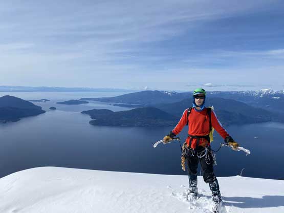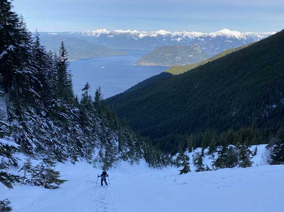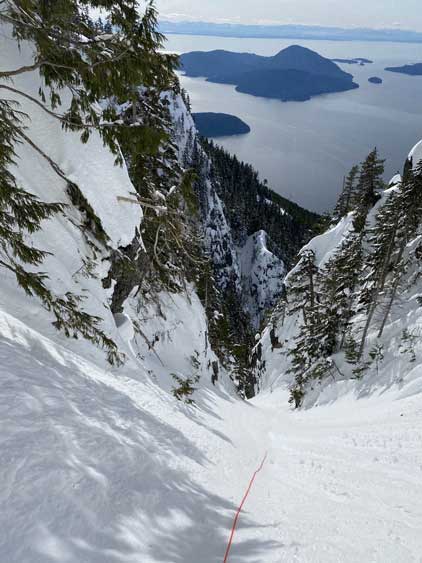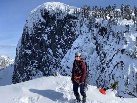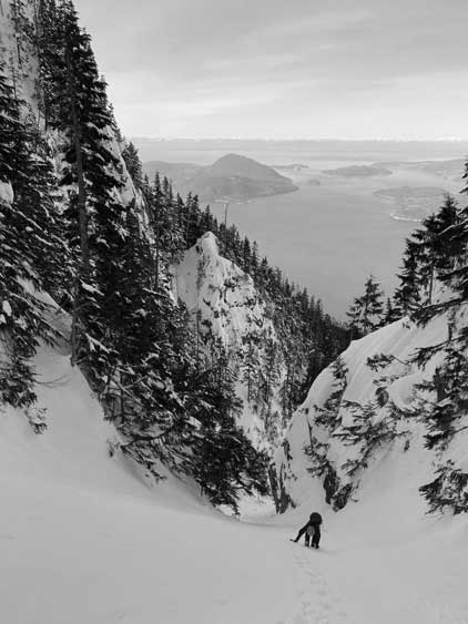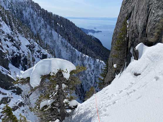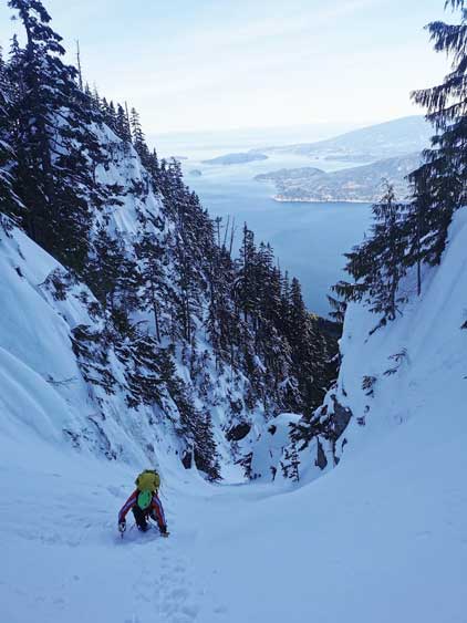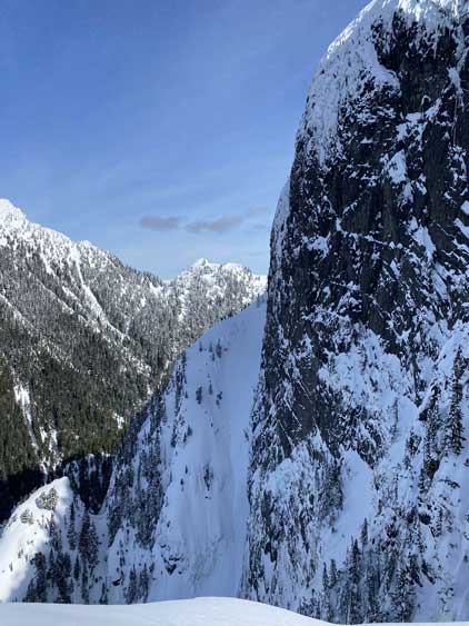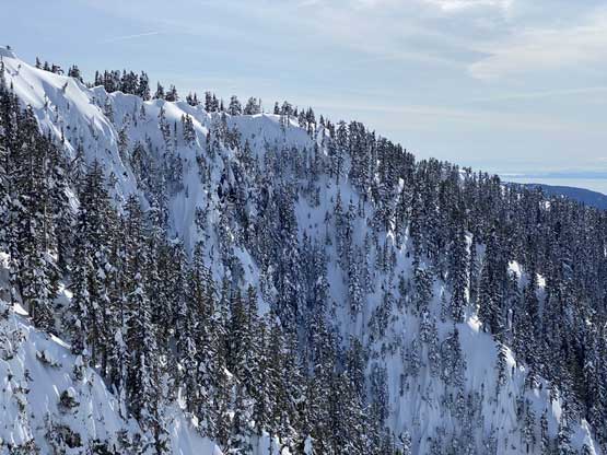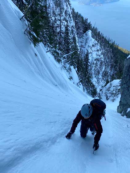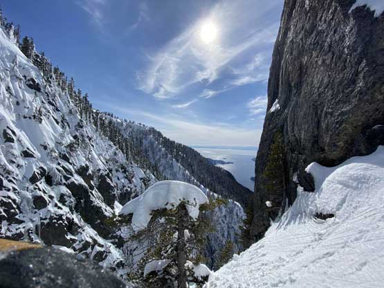 For a few years I thought about to just copy their trip and figure out that ugly traverse and I’ve spent hours analyzing photos taken from various angles, and yet I could not convince myself the feasibility of that traverse, or I should say I didn’t want to embrace the level of vagueness and unknown of that route. Upon further research I came up with a third solution, that was to ascend the climber’s descent gully to near Pup/Harvey col in winter conditions. The descent gully had been reported to involve half a dozen rappels on wet slabs with sketchy anchors in summer conditions, but what about in winter… There was zero information online but the Sentinel Hub satellite images taken in April suggested the gully could very likely be completely filled in with snow that the climb would be no harder than a simple ascent of 45-degree snow. The downside would be the unknown challenges on the south face as winter conditions would make it into the realm of mixed climbing, but the North Shore Mountains usually holds unbelievable amount of good-quality snow that the snowpack might actually ease the difficulty. At least that’s what I was hoping for but I would not count on that. The maximum amount of snow occurs each year around the first half of March in this part of BC so that’s the time I wanted to try this route out. On technical missions like this Winnie M. would be the ideal partner and we pulled the trigger at the last minute upon seeing what seemed like a prime window for the North Shore Mountains. There had been some snow events but numerous gullies had been skied recently with no instability reported whatsoever.