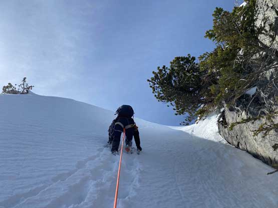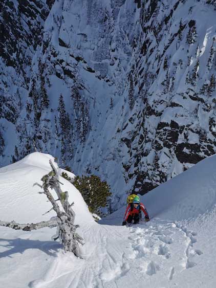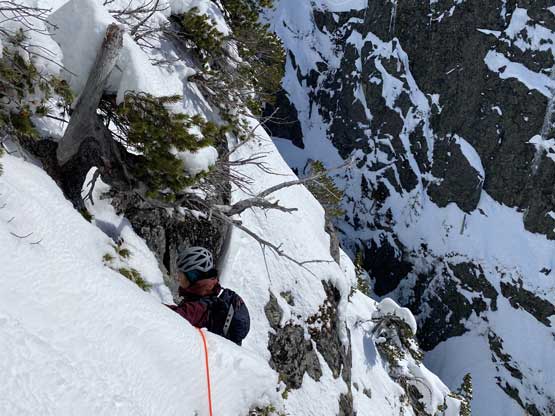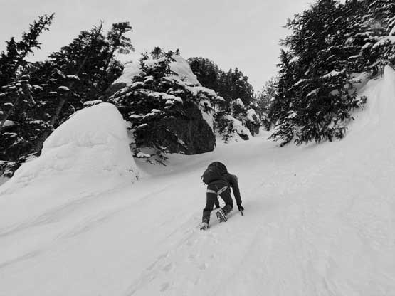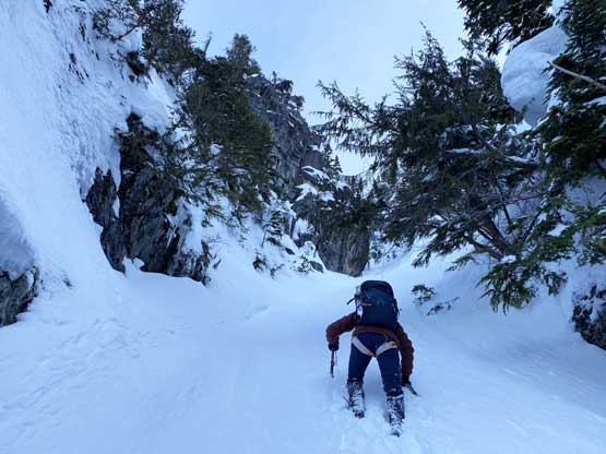 Just about when the couloir started to narrow down into the first constraint we found a flat spot under climber’s right side of the wall to ditch snowshoes and strap crampons on. This first constraint was about 40-45 degrees only but narrowed down to under 3 meters wide. We were both attracted by the ice wall and we promised each other that if we finished the climb with spare time we’d do some laps on the ice. Above the first constraint we had a while of mellower terrain leading into a major fork in the couloir. We would pick the left (narrower) branch shooting straight up towards Pup/Harvey col. The terrain would soon steepen to 45 degrees and we both ditched the pole and took out the second ice tool. The snow climbing was fairly mellow thank to the superb conditions. We did encounter a few stretches of front-pointing but for the most parts we were able to kick bucket steps into the slope. Near the top of the gully I led us trending climber’s left into a zone of 50-degree forest and we kept soloing until what seemed like a 60-degree icy pitch stopped the further progress. I gave the rope to Winnie and she soloed it with no problem. I soloed it halfway up but didn’t quite trust the ice tool placements so asked her to drop the rope down for a belay. Awkward… After about 10 minutes of heavy spindrifts the rope finally reached me and now with safety on my side the steep snice climbing felt actually quite fun.