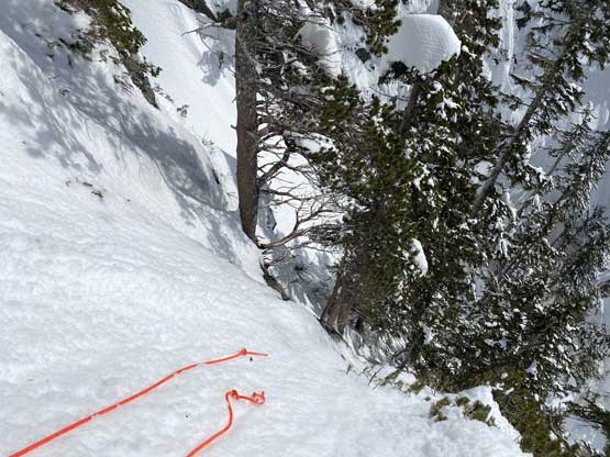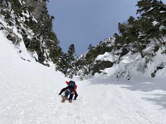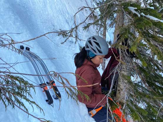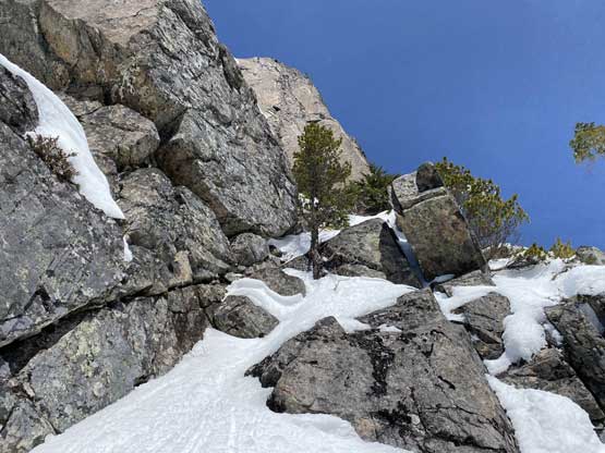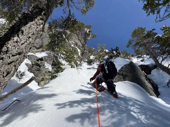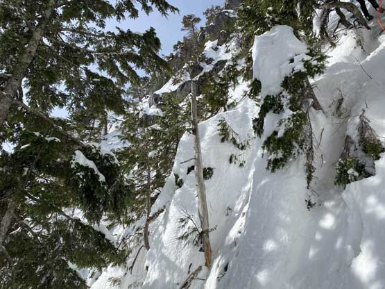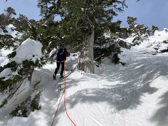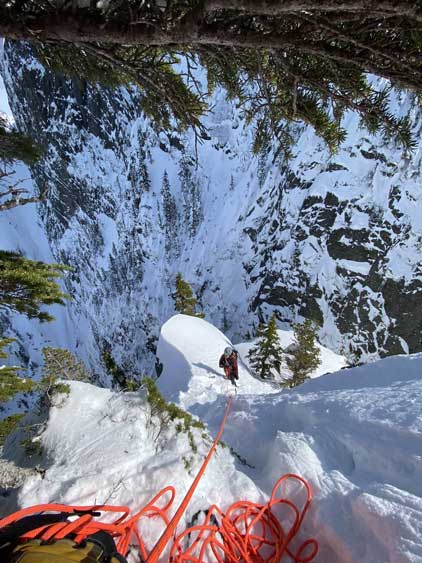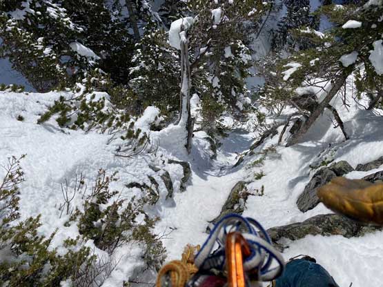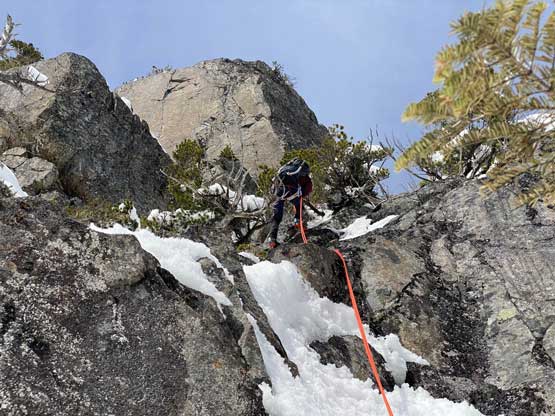 The summit was surprisingly spacious so we lingered a long while soaking in the views. We were not in a hurry to descend as we were doing great on time. For the descent we decided to gingerly down-climb the upper route around the rock buttress to save some hassle. Then I led three rappels down roughly our ascent line from one tree station to another. The last rappel was optional but the trees were too good to not use. By this point the gully/couloir was baked under the sun for a few hours so the down-climbing no longer involved front-pointing. Fresh snow balling under the crampons were pretty annoying though, but nonetheless we made some fast progress down the gully. Lower down the sun’s out again and we each did two laps on that short ice wall. This was my first ever time climbing on waterfall ice and I had to say it’s very fun. Descending the lower gully on those hard avi debris was not as fun but not difficult.